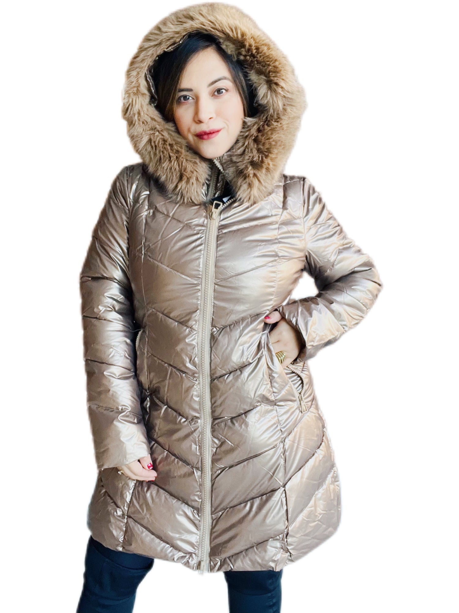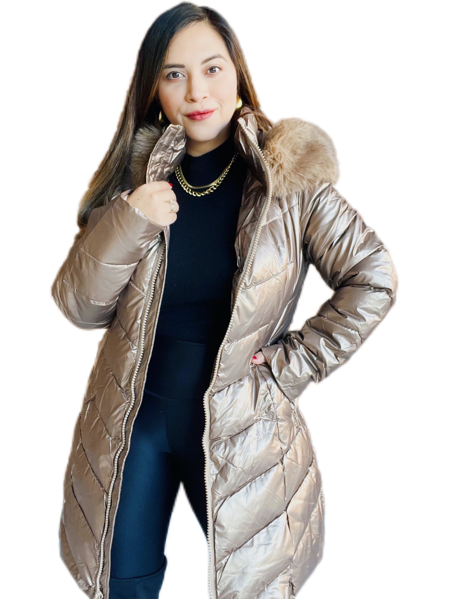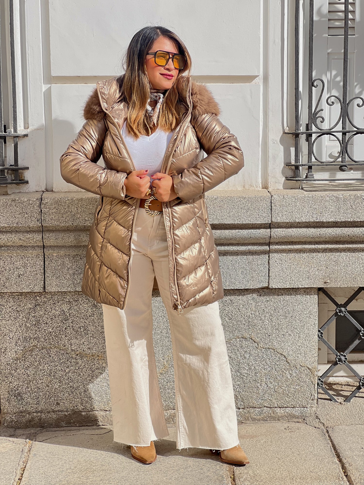 Mantente abrigada y con estilo esta temporada con este abrigo acolchado de corte evasé, diseñado para combinar funcionalidad y elegancia. Su diseño incluye detalles cuidadosamente pensados como una capucha con pelo sintético desmontable y puños elásticos, para adaptarse a cualquier clima.