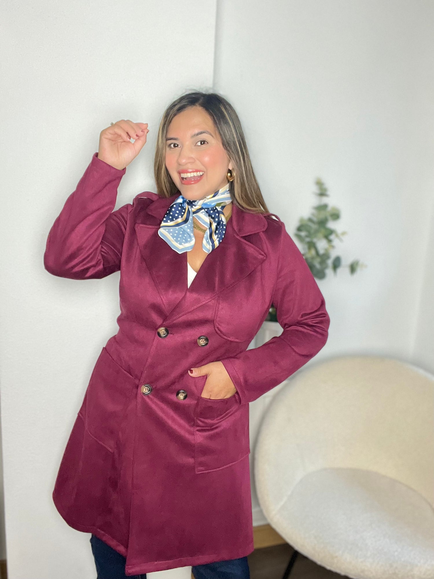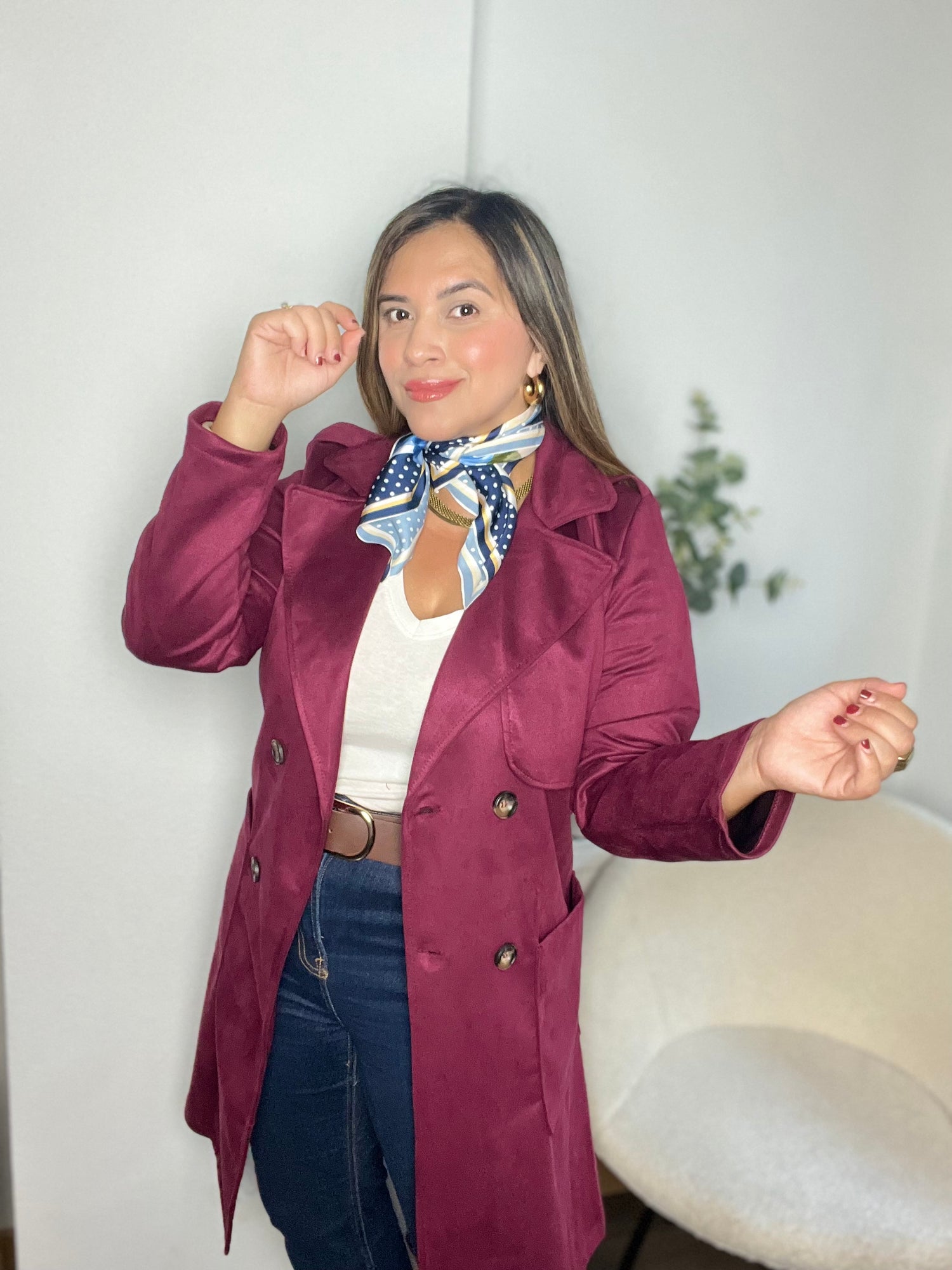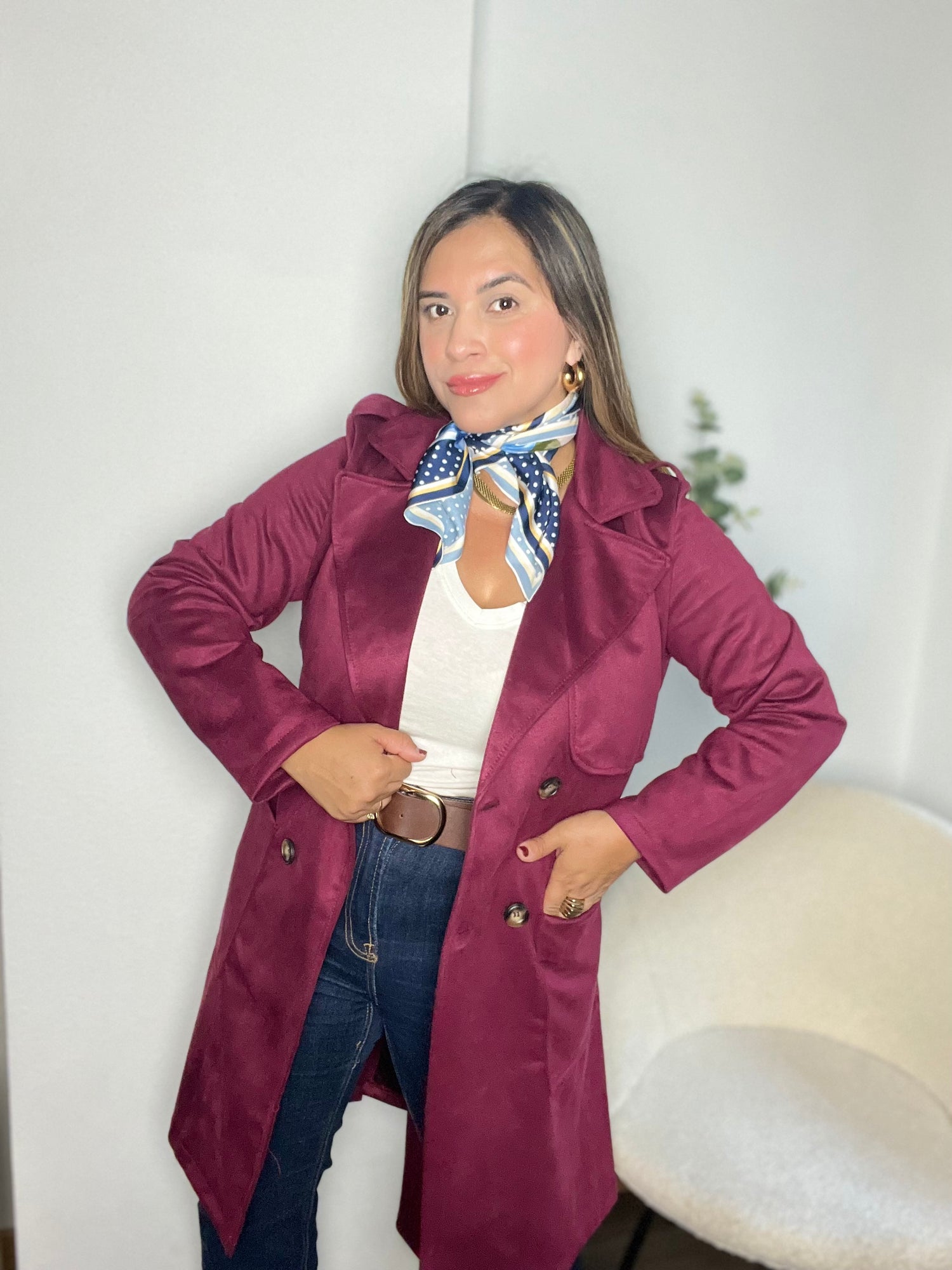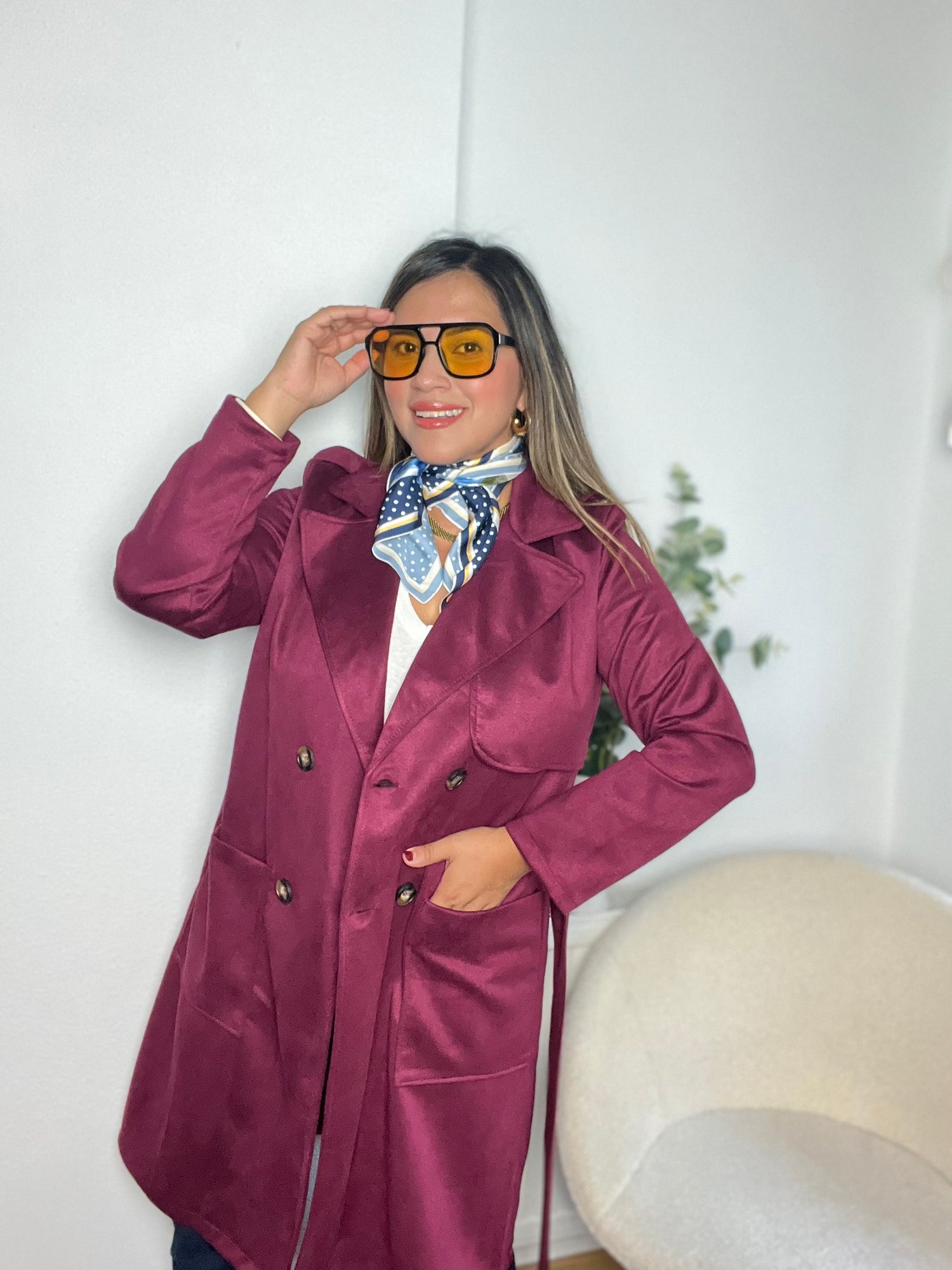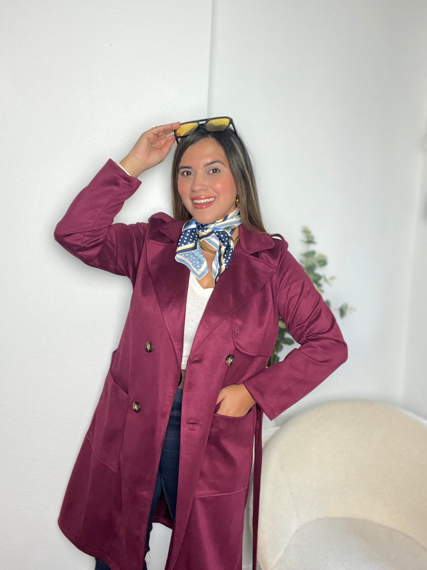 Abrigo antelina burdeos , cierre con botones anacarados bolsillos laterales cuerda para ajustar cintura