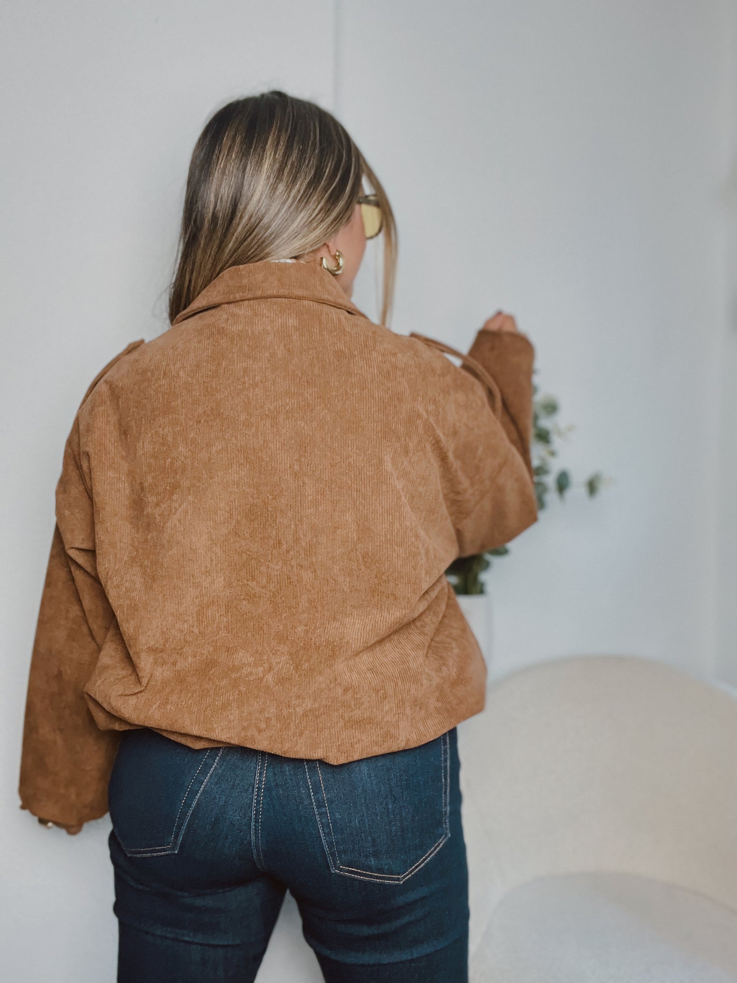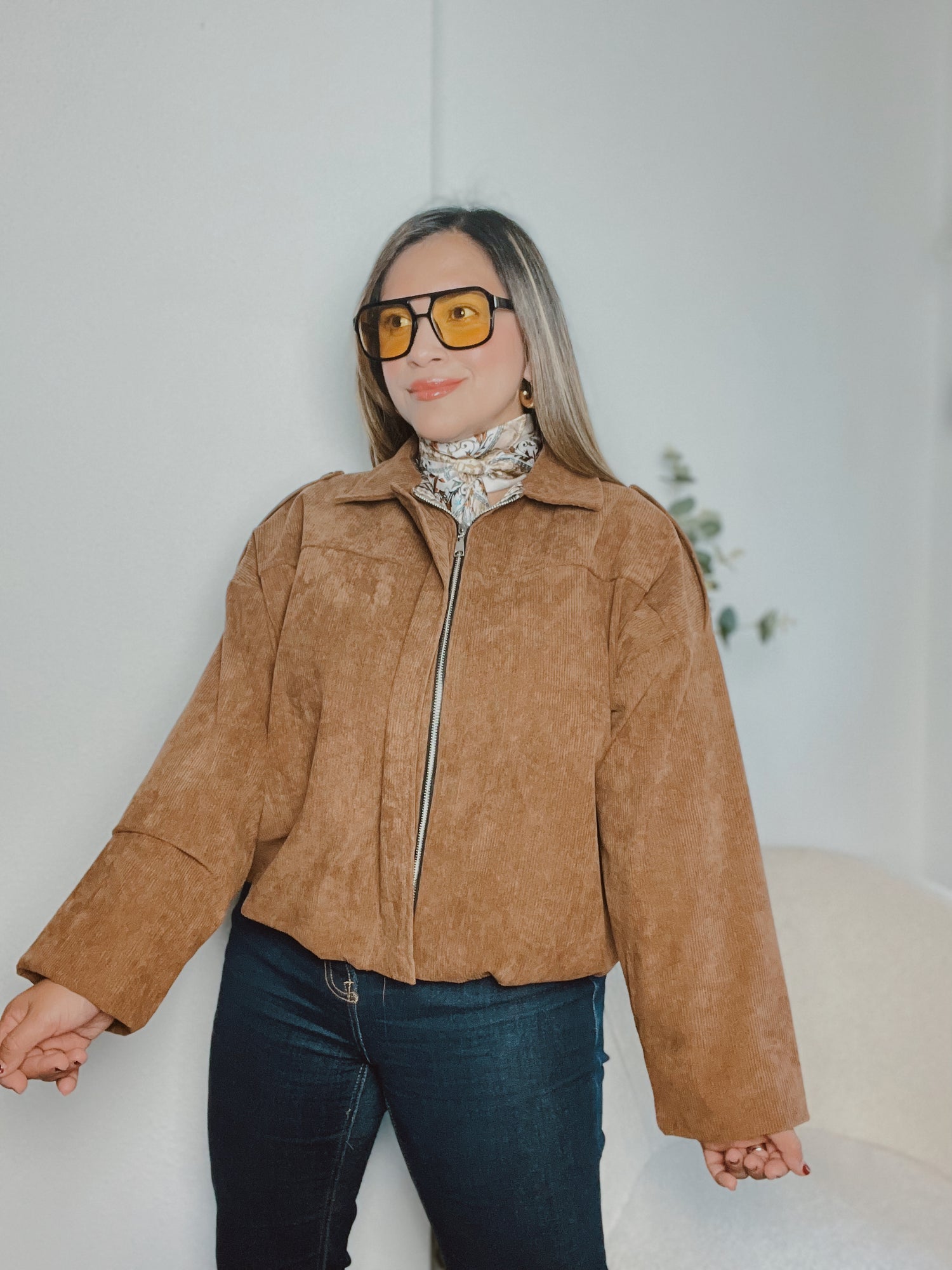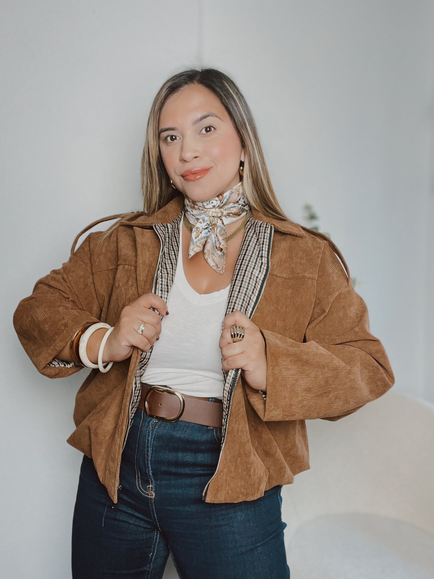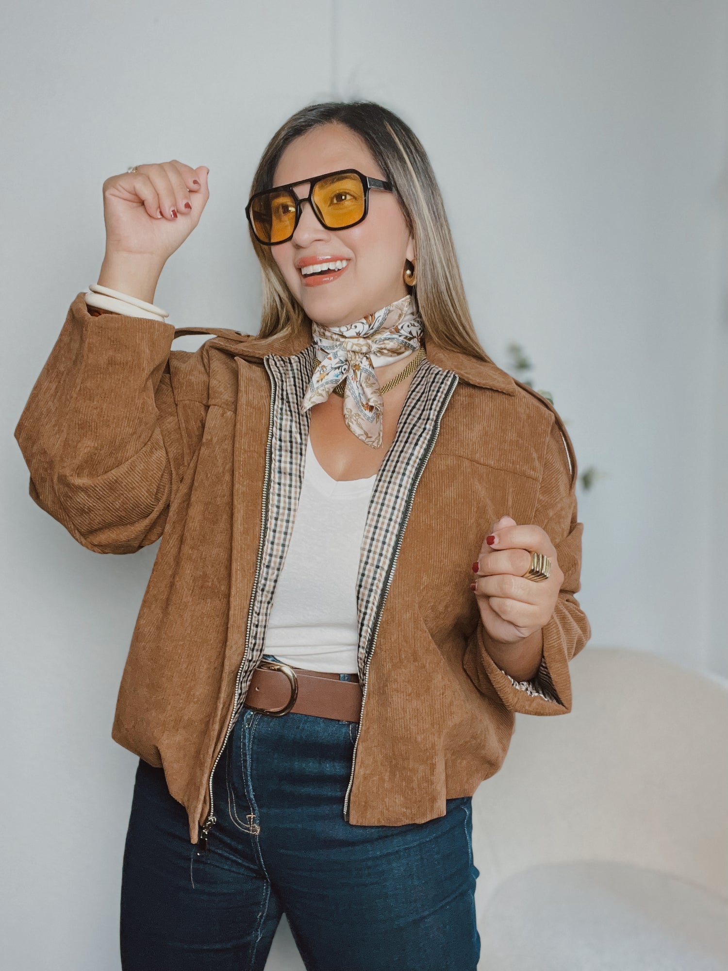 Bomber Pana color camel forro en el interior de estampado de cuadros