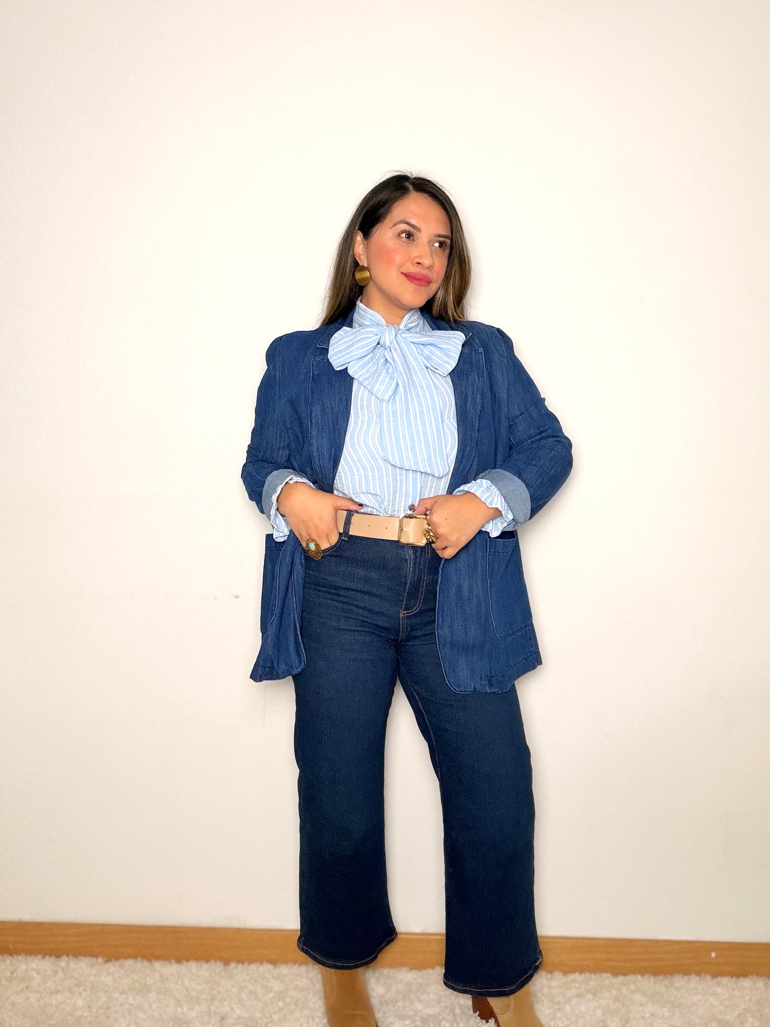 Esta blusa azul con lazo es una de esas piezas que elevan cualquier look sin esfuerzo. Su diseño de rayas finas en tono azul claro aporta frescura y elegancia, mientras que el lazo en el cuello añade un toque femenino y sofisticado, muy en línea con un estilo clásico renovado.