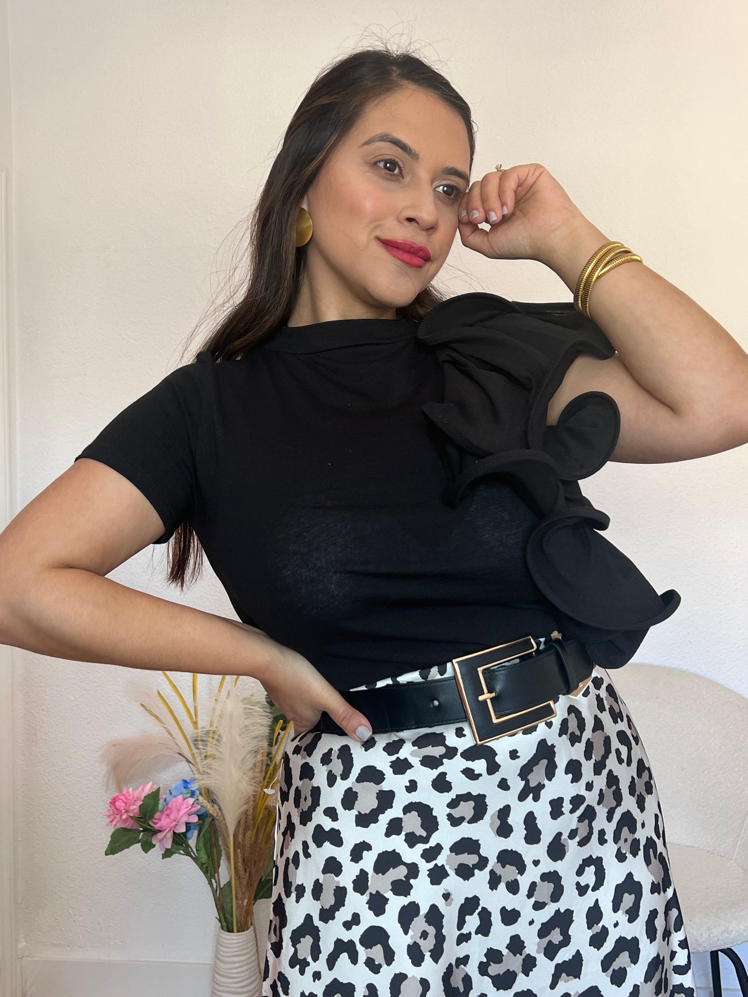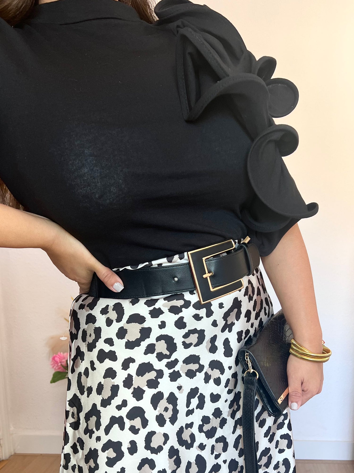 La Camisa Sevilla en negro destaca por su elegante detalle en vuelo y cuello redondo, aportando un toque sofisticado a tu look.