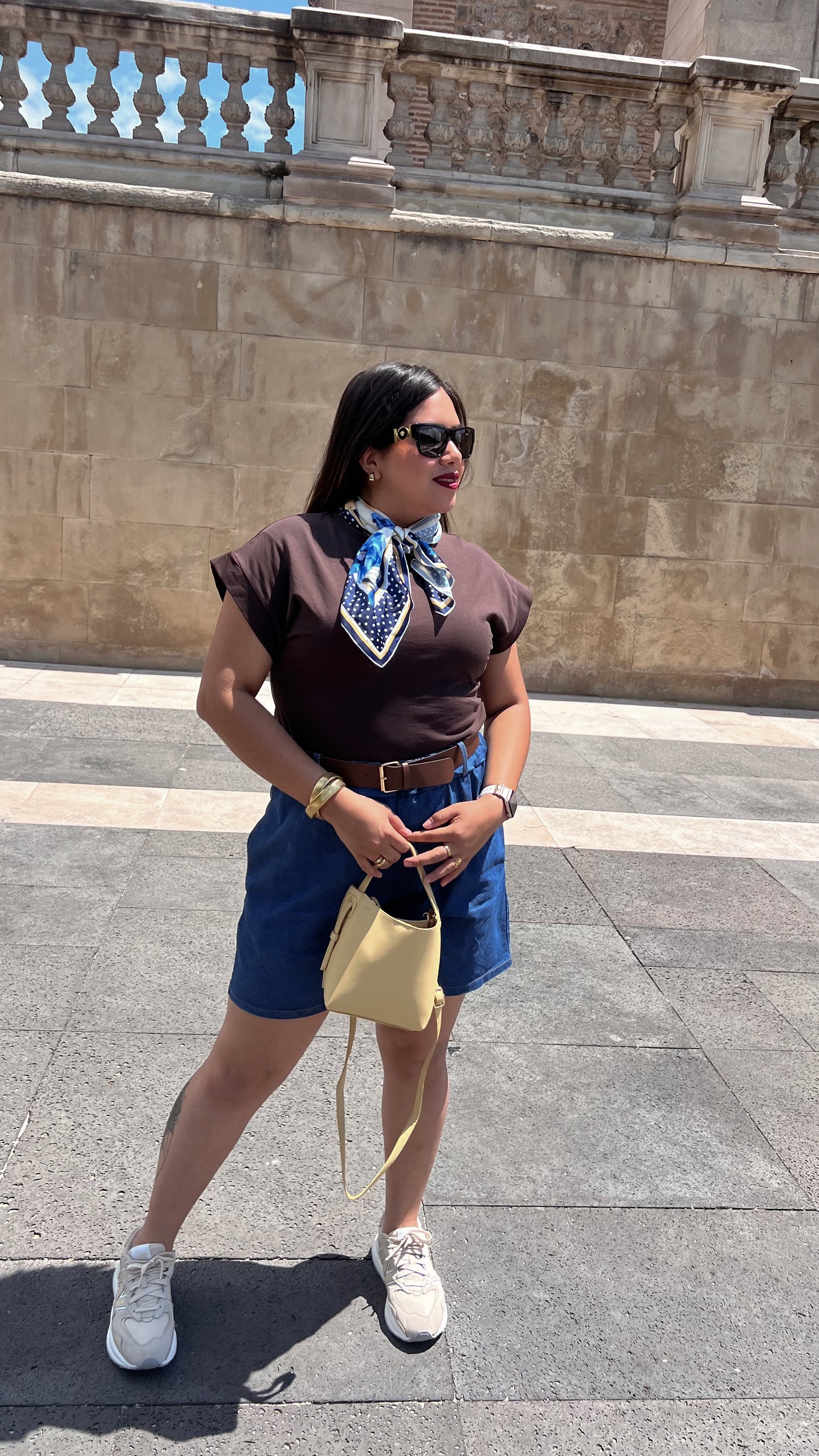 Un básico con un twist chic. Esta camiseta de algodón en varios, ligera y perfecta para el día a día. El detalle estrella: un pañuelo estilo seda en tonos azul, blanco y dorado con estampado floral y de lunares, que aporta un aire sofisticado y femenino sin esfuerzo.