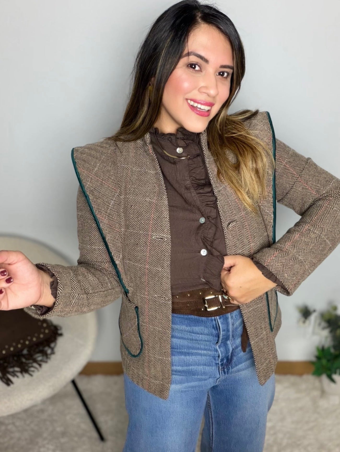 La Chaqueta Eloísa es una prenda elegante y versátil, confeccionada en un tejido tipo espiga en tono marrón con delicadas líneas finas que aportan un toque clásico y atemporal. Presenta un diseño estructurado con hombreras marcadas que realzan la figura y añaden presencia, acompañado de un ribete verde profundo que resalta las solapas y bolsillos, dándole un acabado refinado y distintivo.