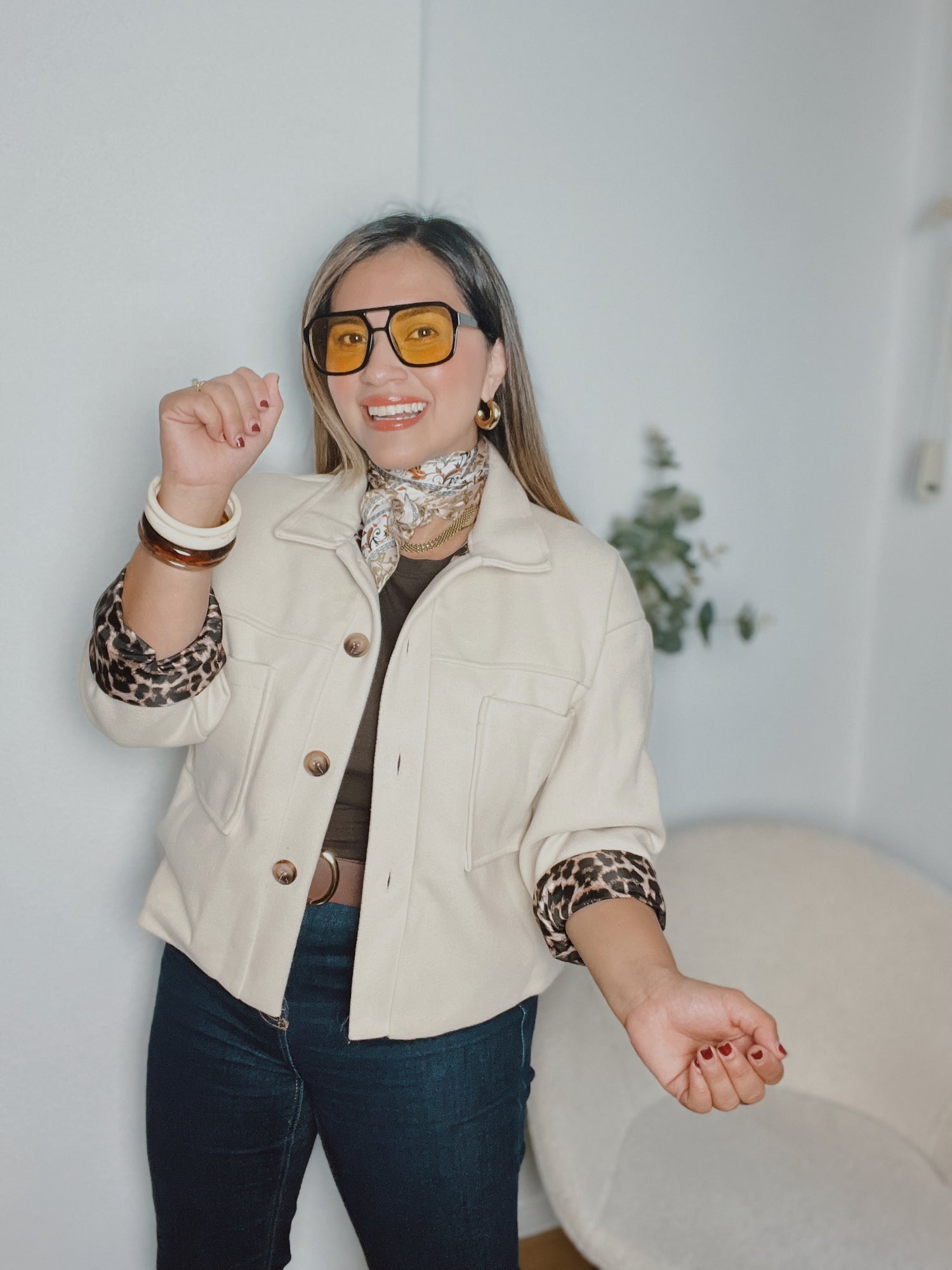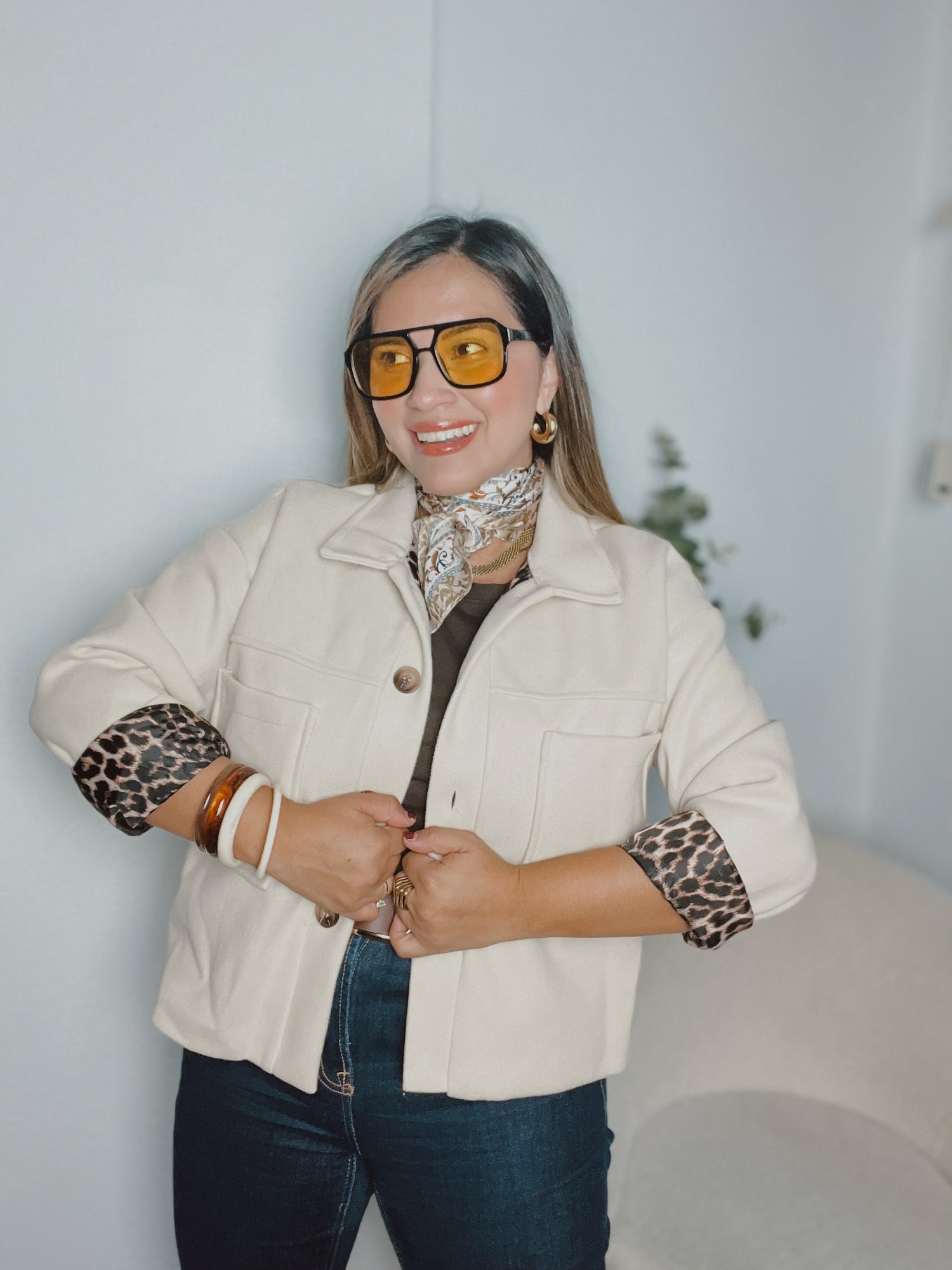 Chaqueta paño color crema con forro de estampado animal print con cierre de botones delanteros, detalle botones anacarados, bolsillos delanteros
