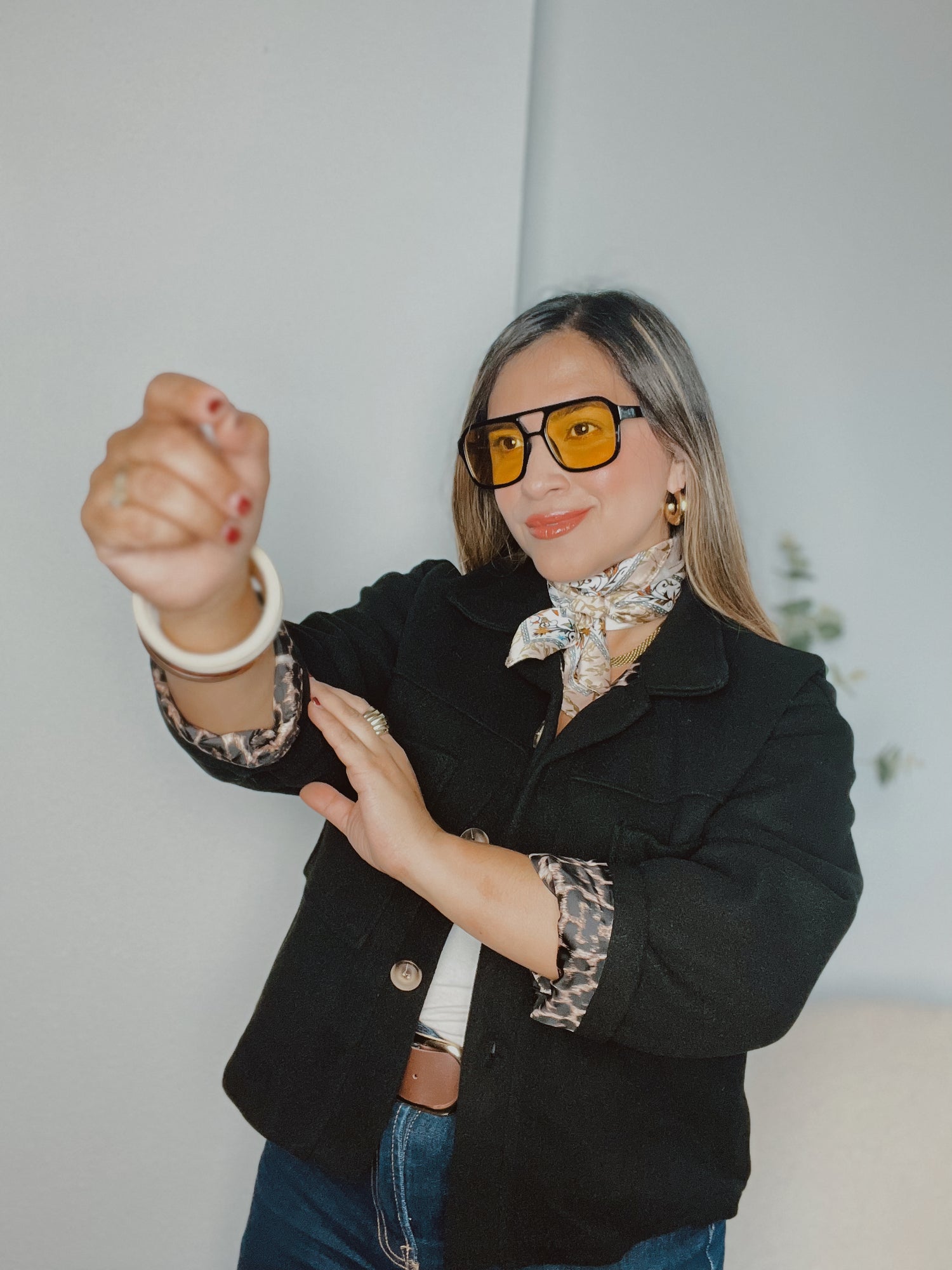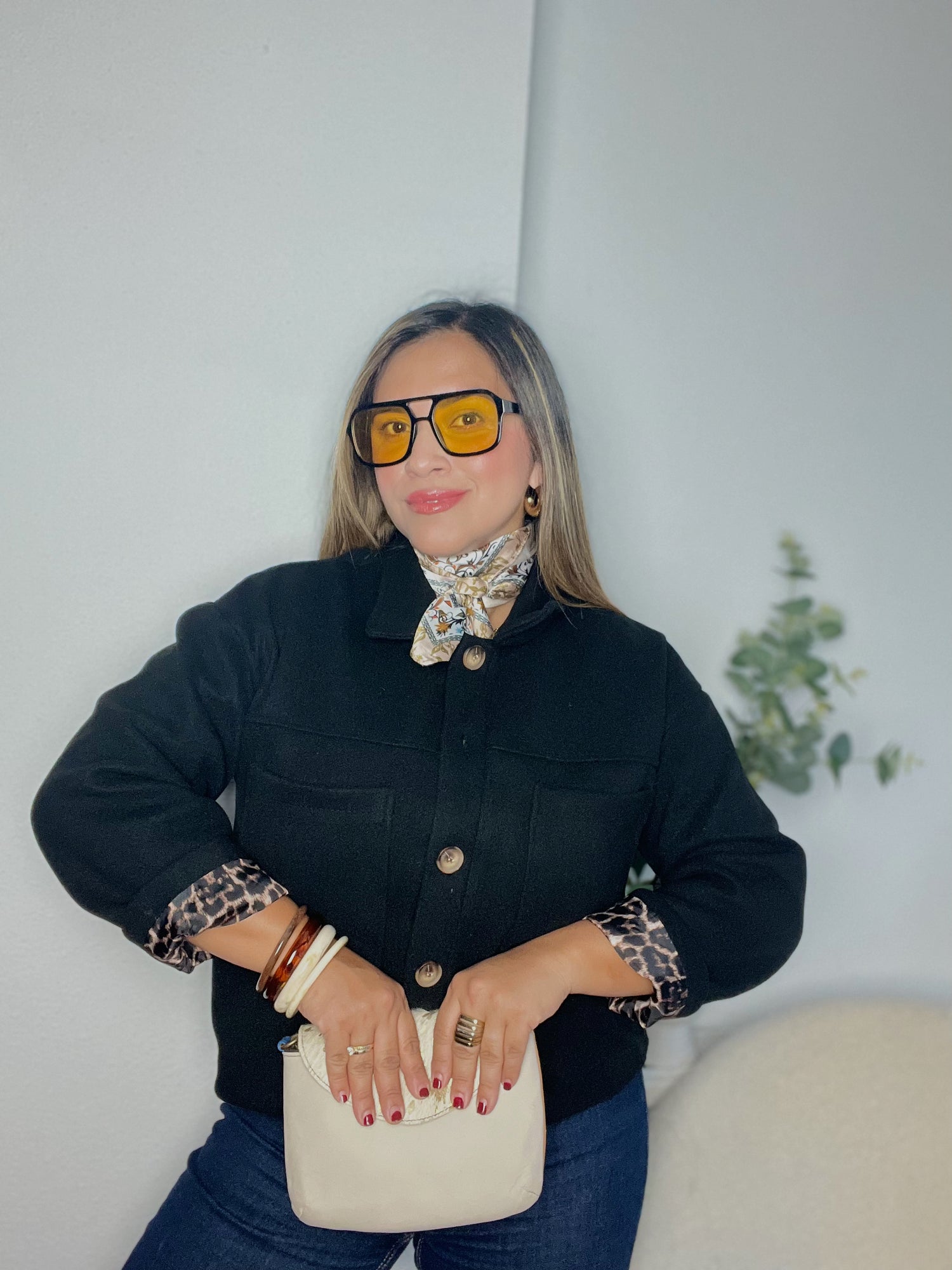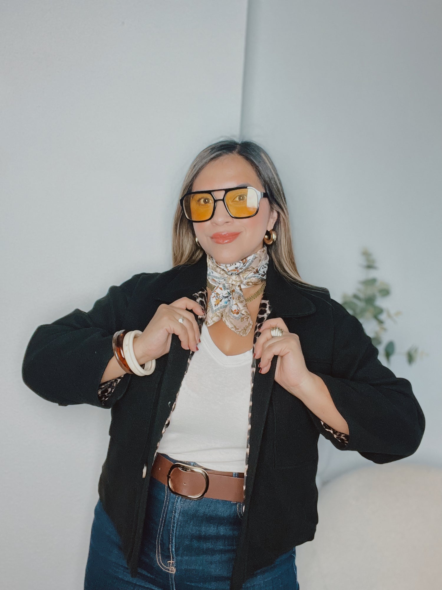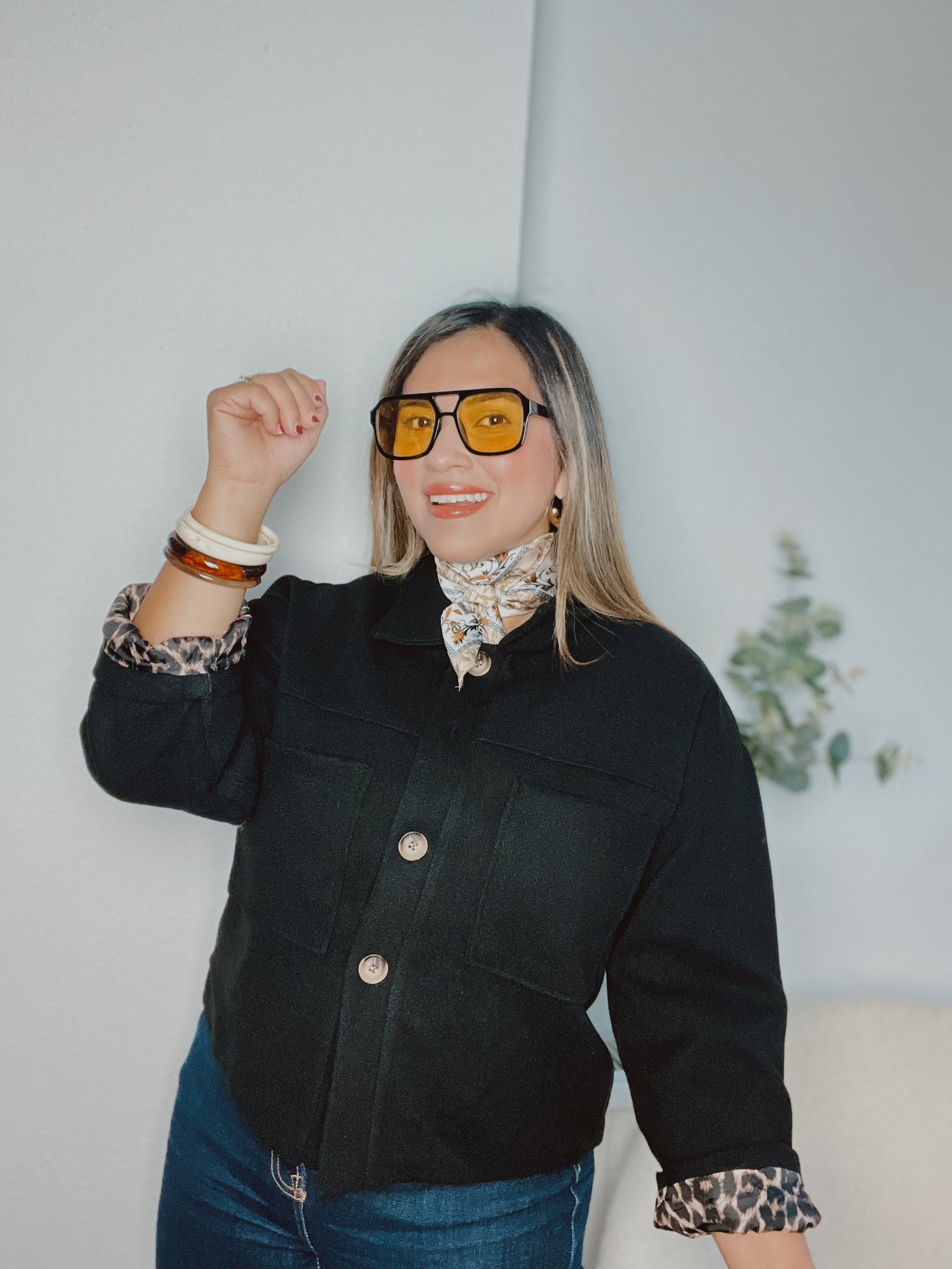 Chaqueta paño negra con forro de estampado animal print con cierre de botones delanteros, detalle botones anacarados, bolsillos delanteros