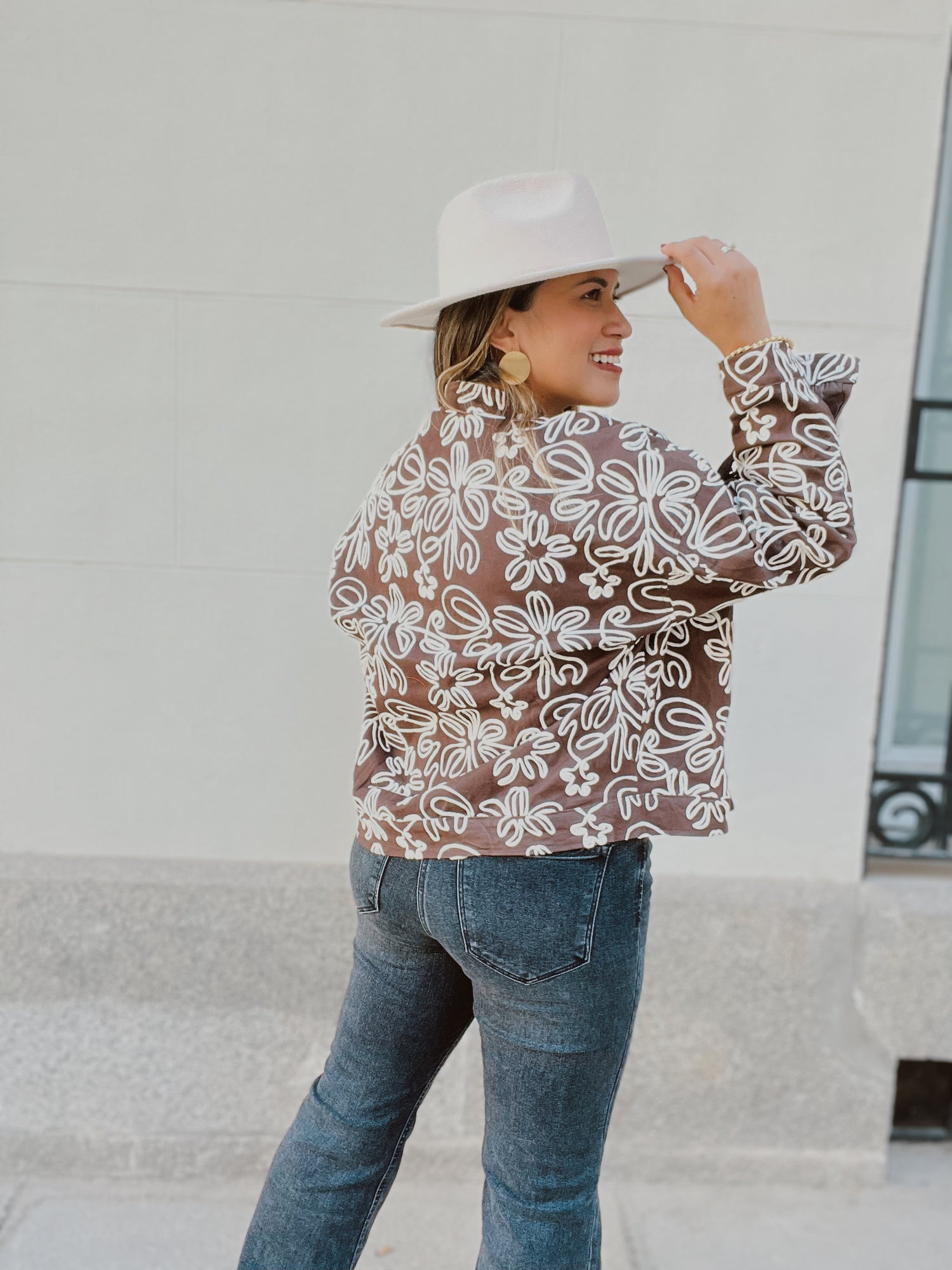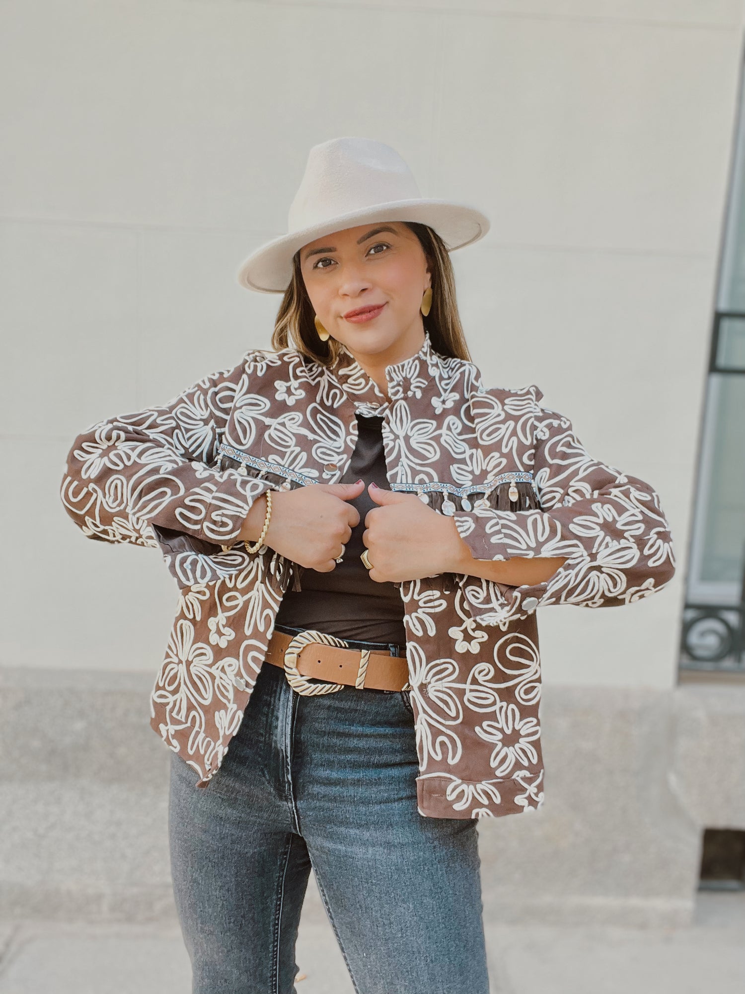 La Chaqueta Olivia es una prenda statement que eleva cualquier look con su encanto boho-chic. Su diseño en tono marrón con estampado floral en relieve beige combina elegancia y personalidad, perfecta para destacar esta temporada.
