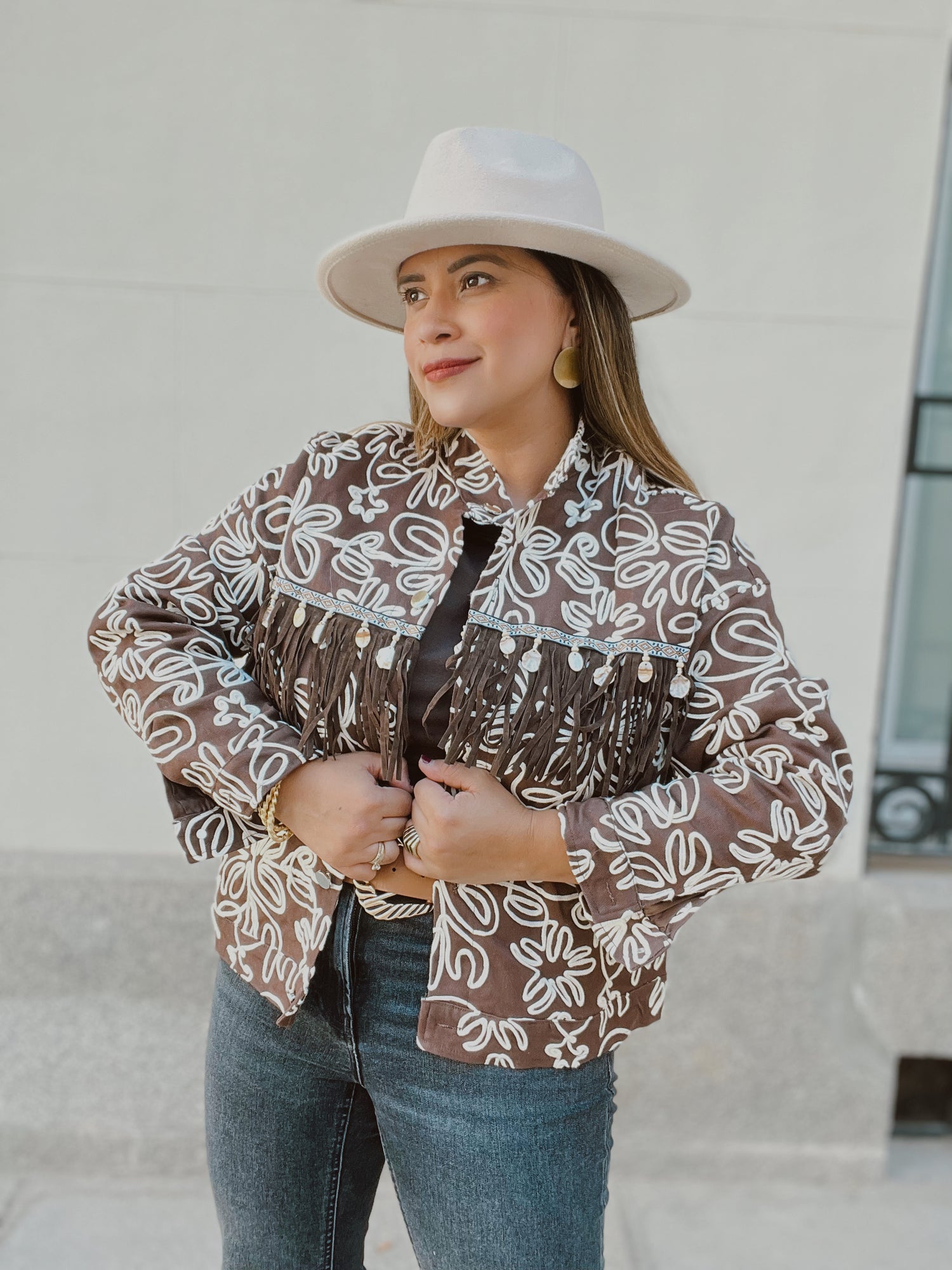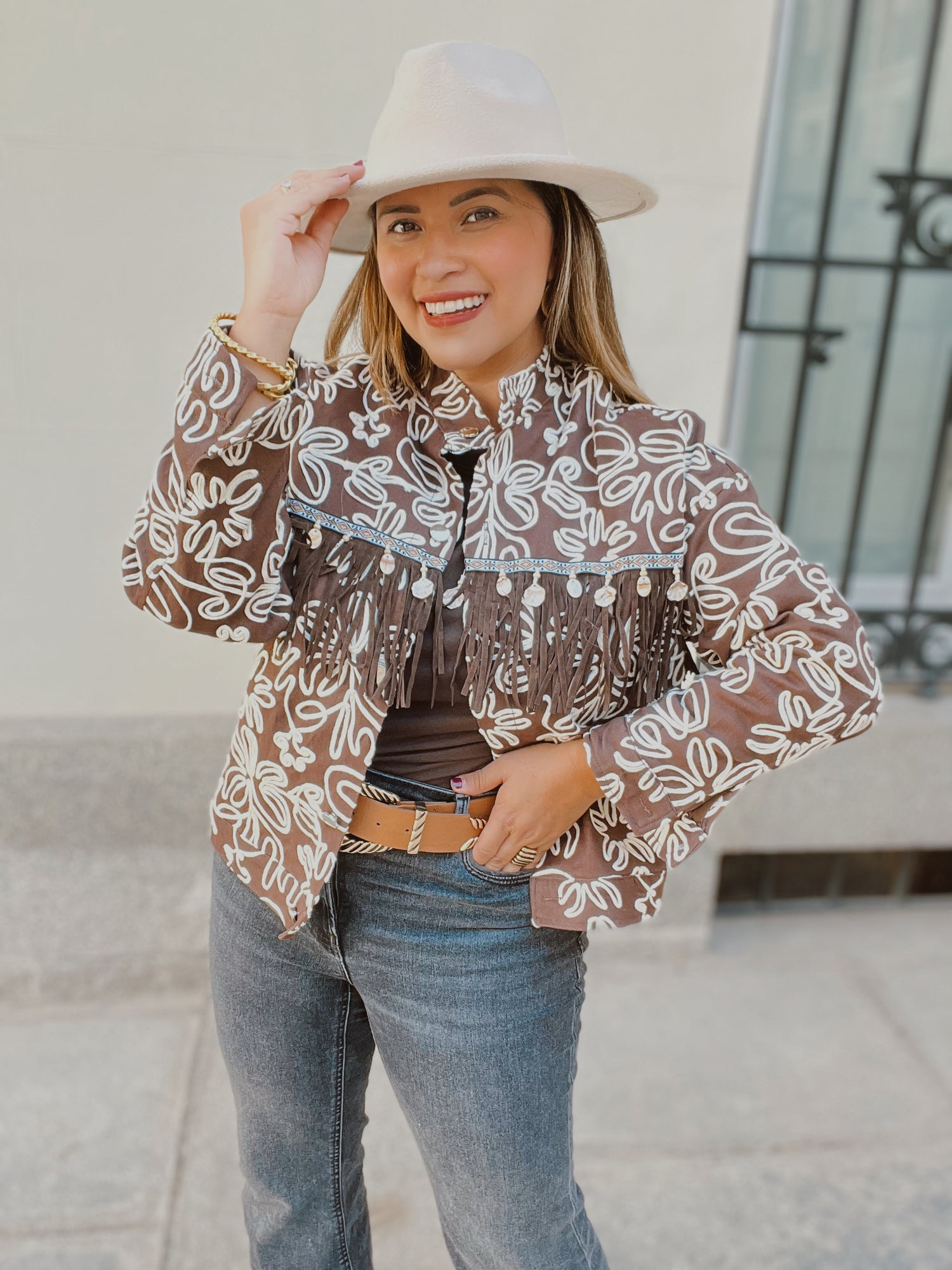 El detalle de flecos en el pecho con apliques decorativos añade movimiento y estilo, mientras que su corte estructurado favorece la figura sin perder comodidad. Ideal para combinar con vaqueros, botas y sombrero para un look otoñal con carácter.