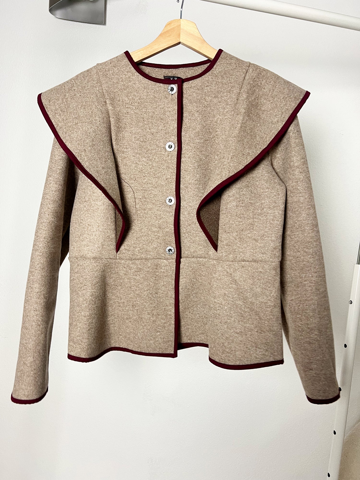 Su diseño estructurado con ribetes en color burdeos aporta un toque sofisticado y femenino, perfecto para elevar cualquier look.