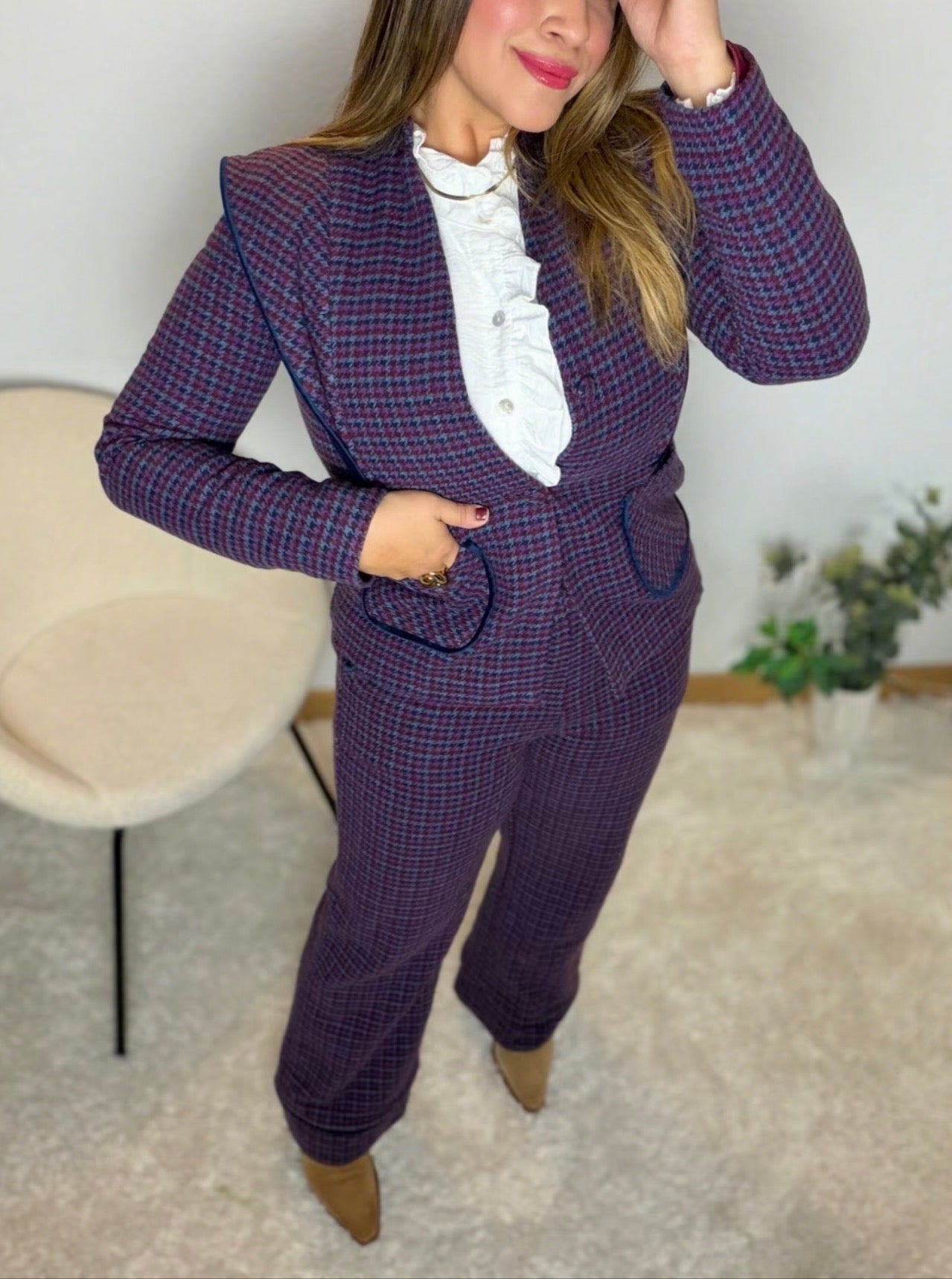 Chaqueta Sastre Entallada con Cuadro Inglés – Azul y Burdeos
