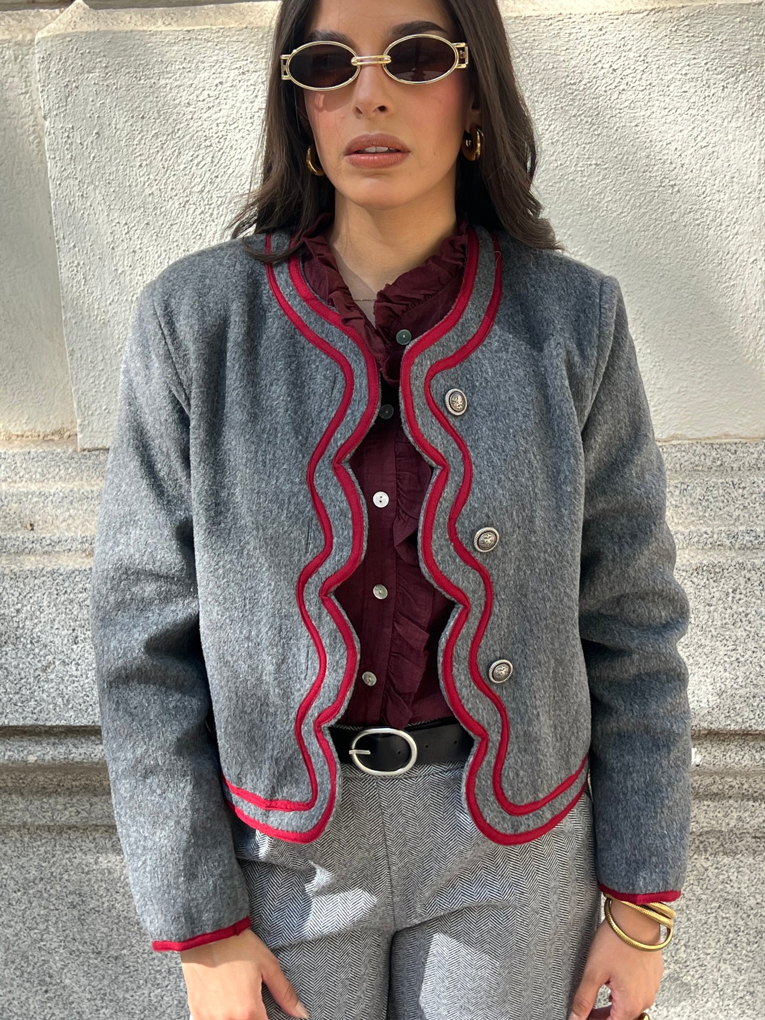 La Chaqueta Viena Gris Burdeos combina elegancia y modernidad en una prenda versátil perfecta para los días frescos. Su diseño estructurado resalta con un delicado relieve en tono burdeos que enmarca todo el contorno, aportando un toque femenino y sofisticado.