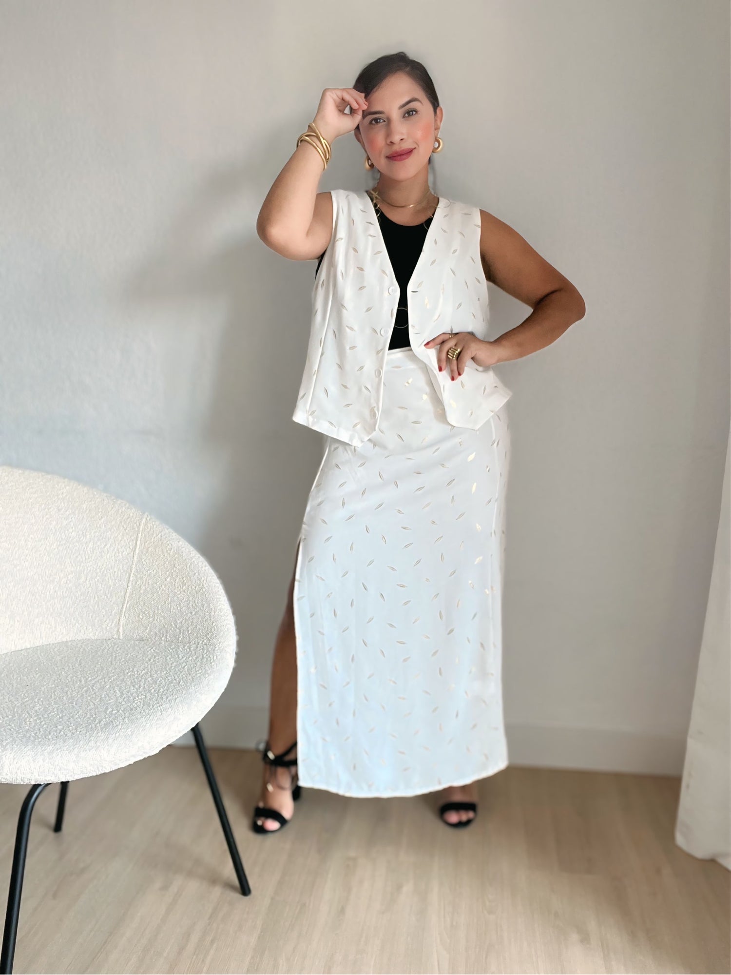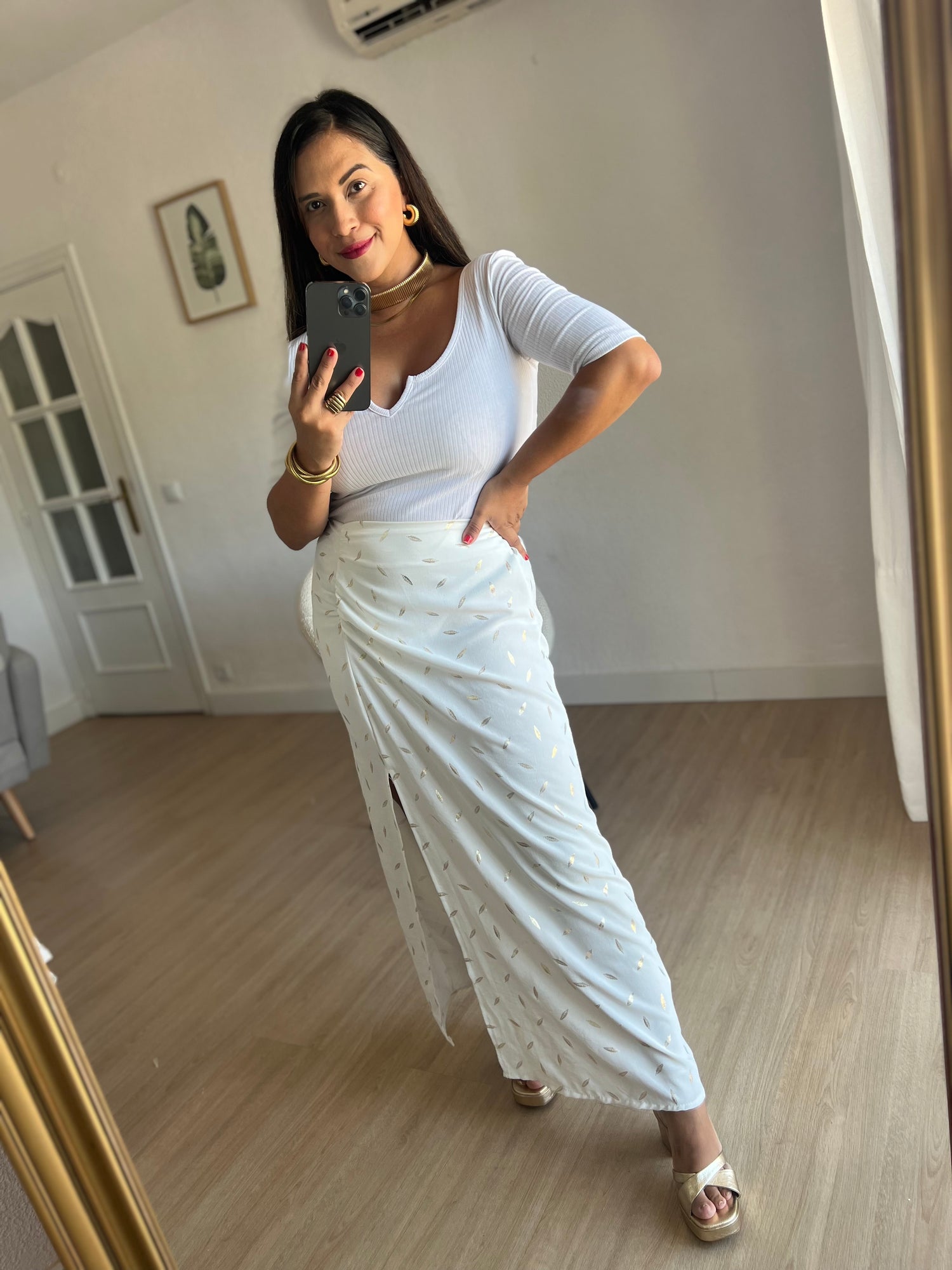 Su diseño en blanco con delicados detalles dorados aporta un toque sofisticado, mientras que la abertura en la piernala convierte en una opción fresca y femenina.