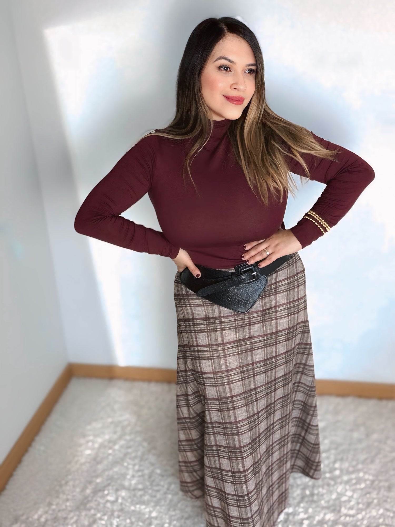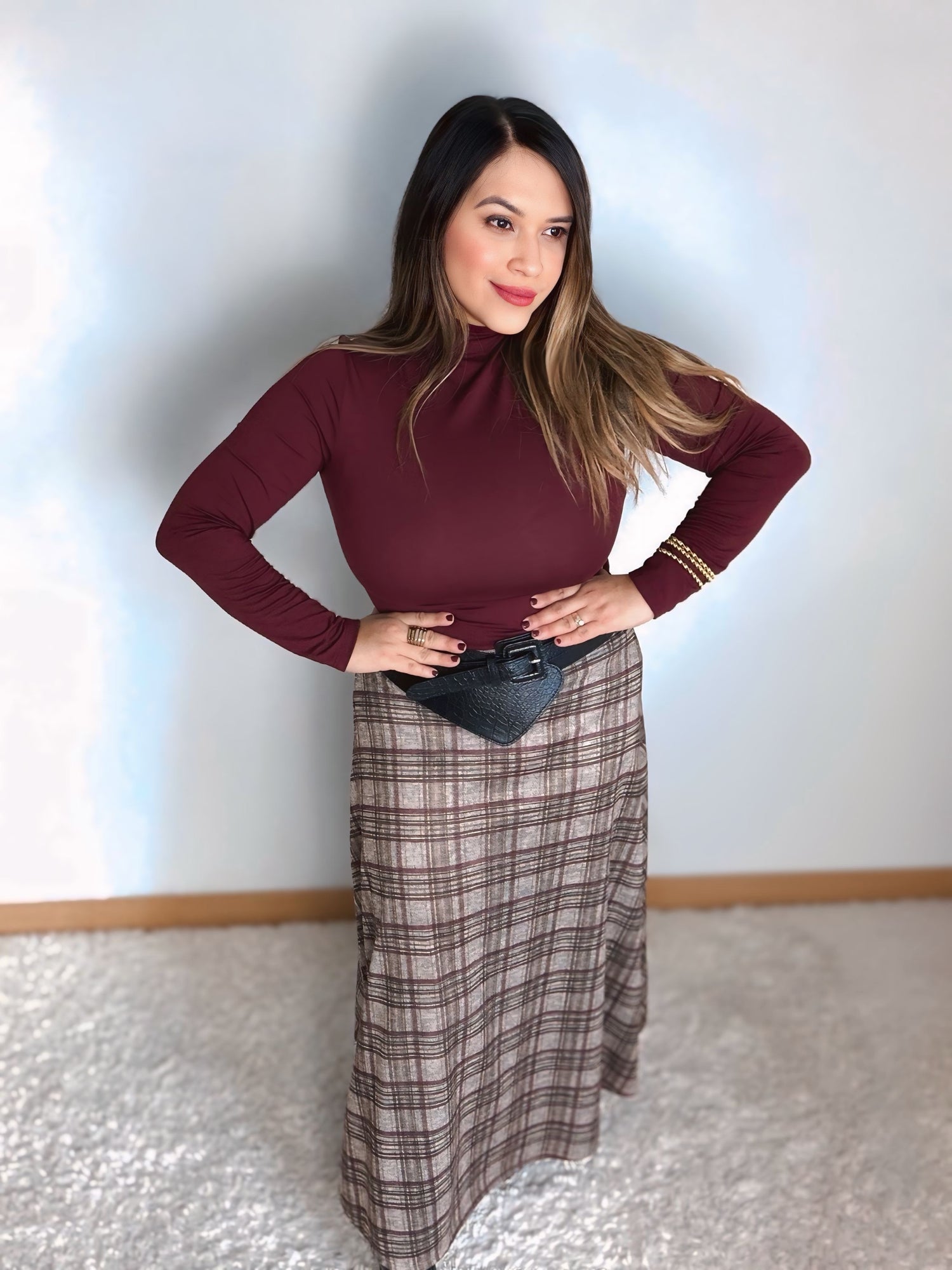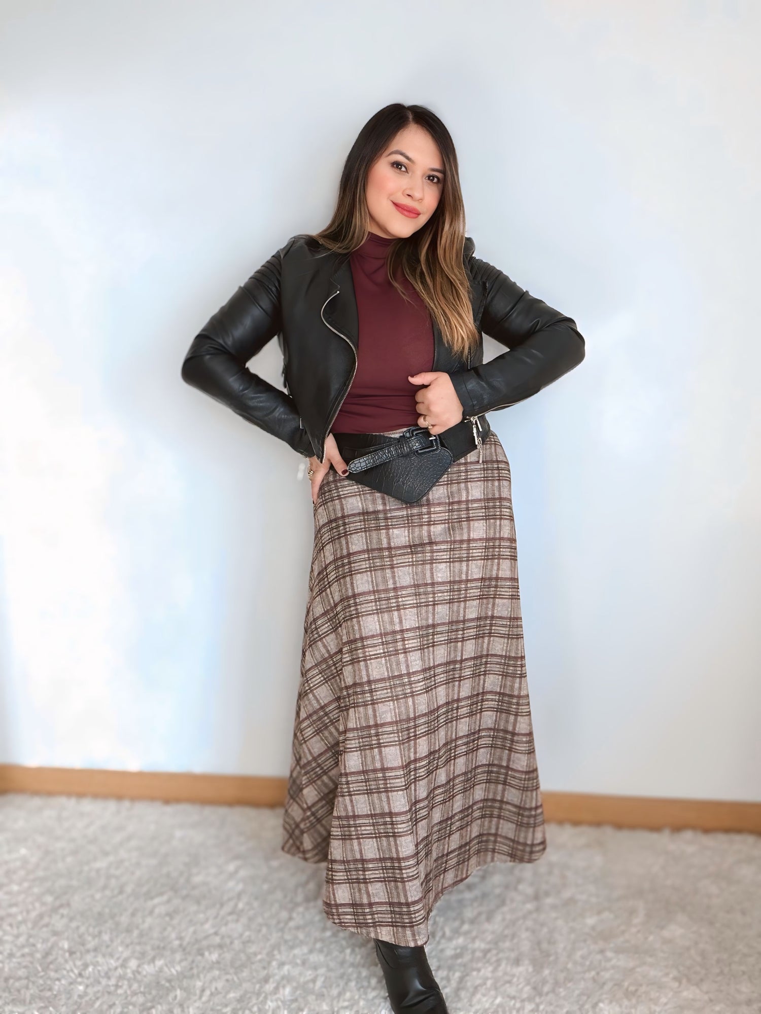Sofisticada y muy fácil de combinar,esta falda midi de cuadros en tonos burdeos, beige y marrón es ese fondo de armario que eleva cualquier look. Su diseño fluido aporta movimiento y estiliza la silueta, perfecta para crear outfits elegantes tanto de día como de noche.