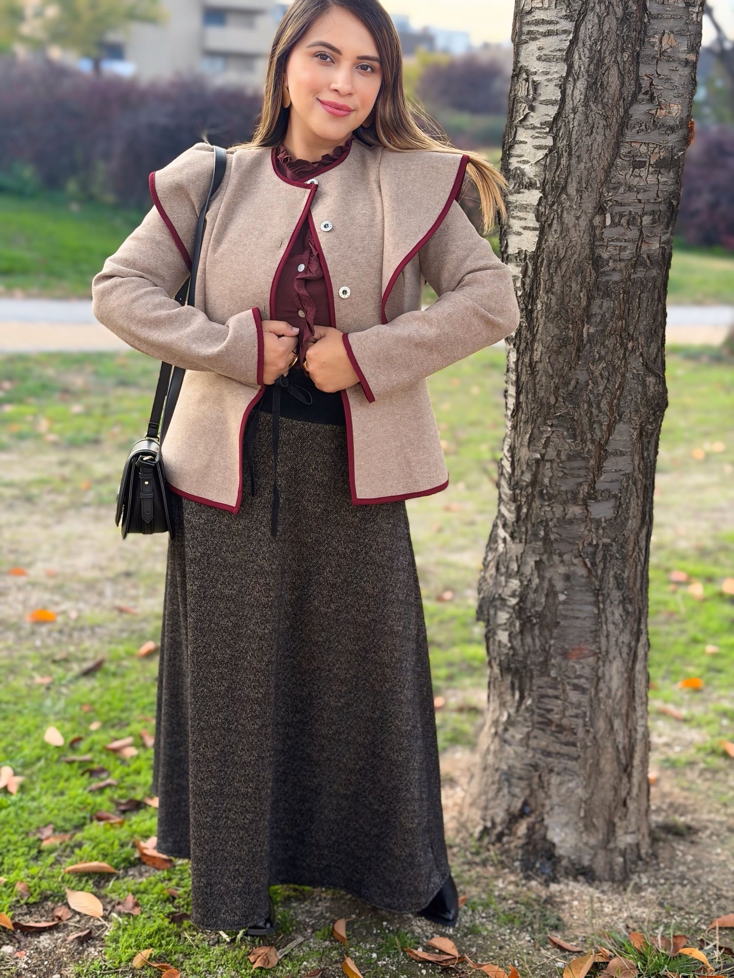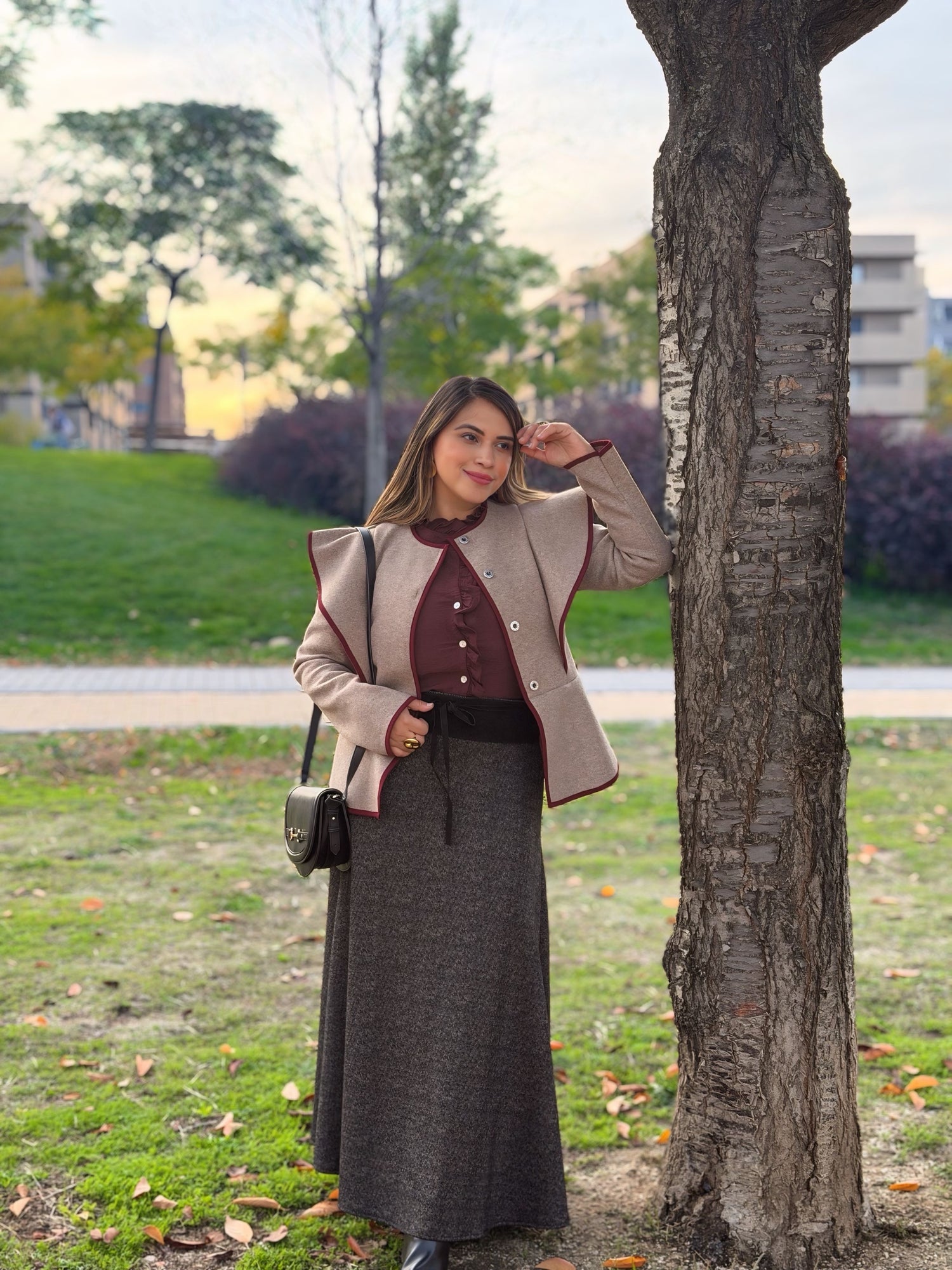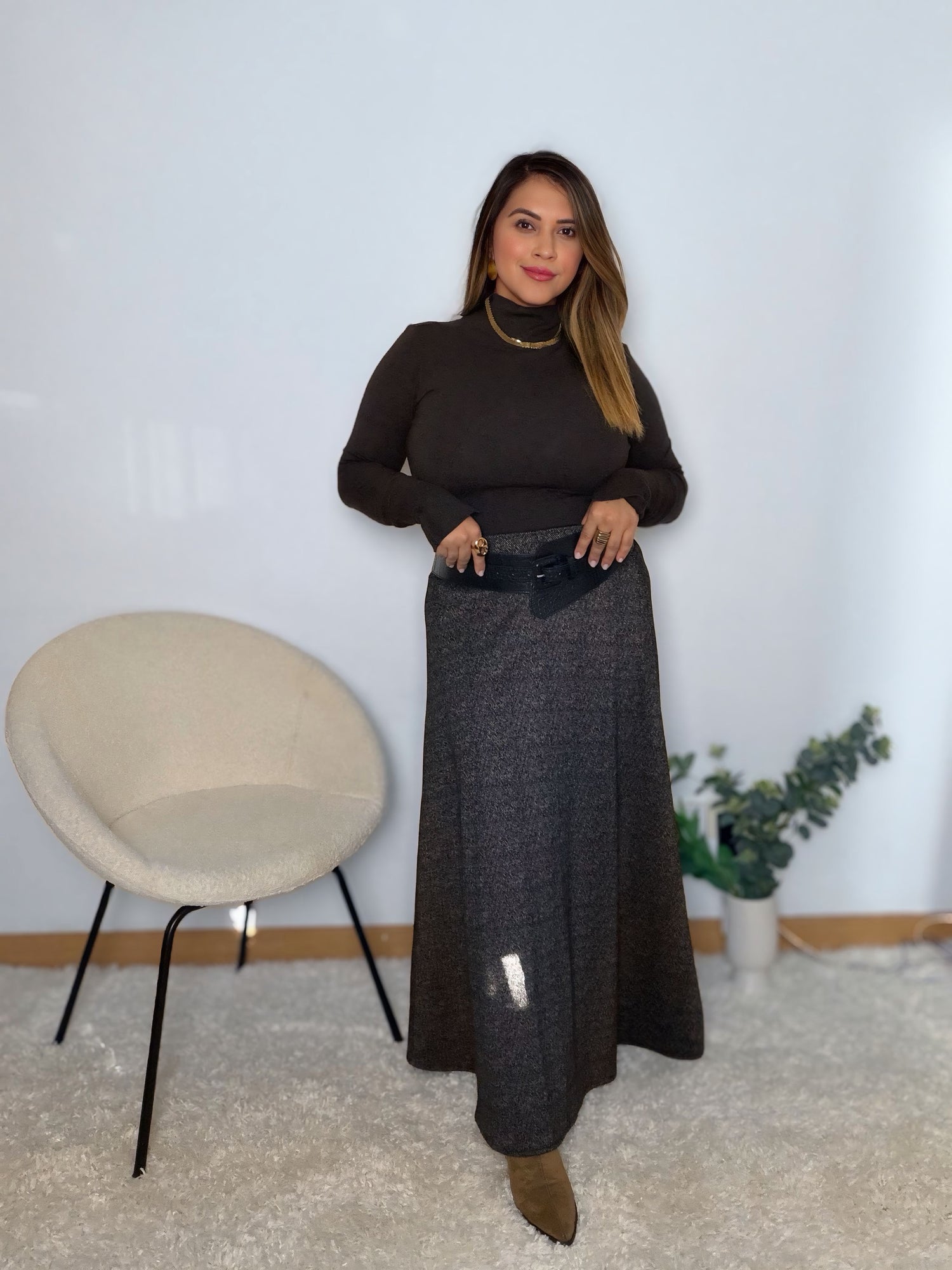 Esta falda larga está confeccionada en tejido de poliéster de textura suave y ligeramente estructurada, ideal para las temporadas frescas.