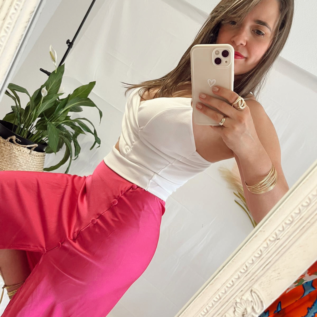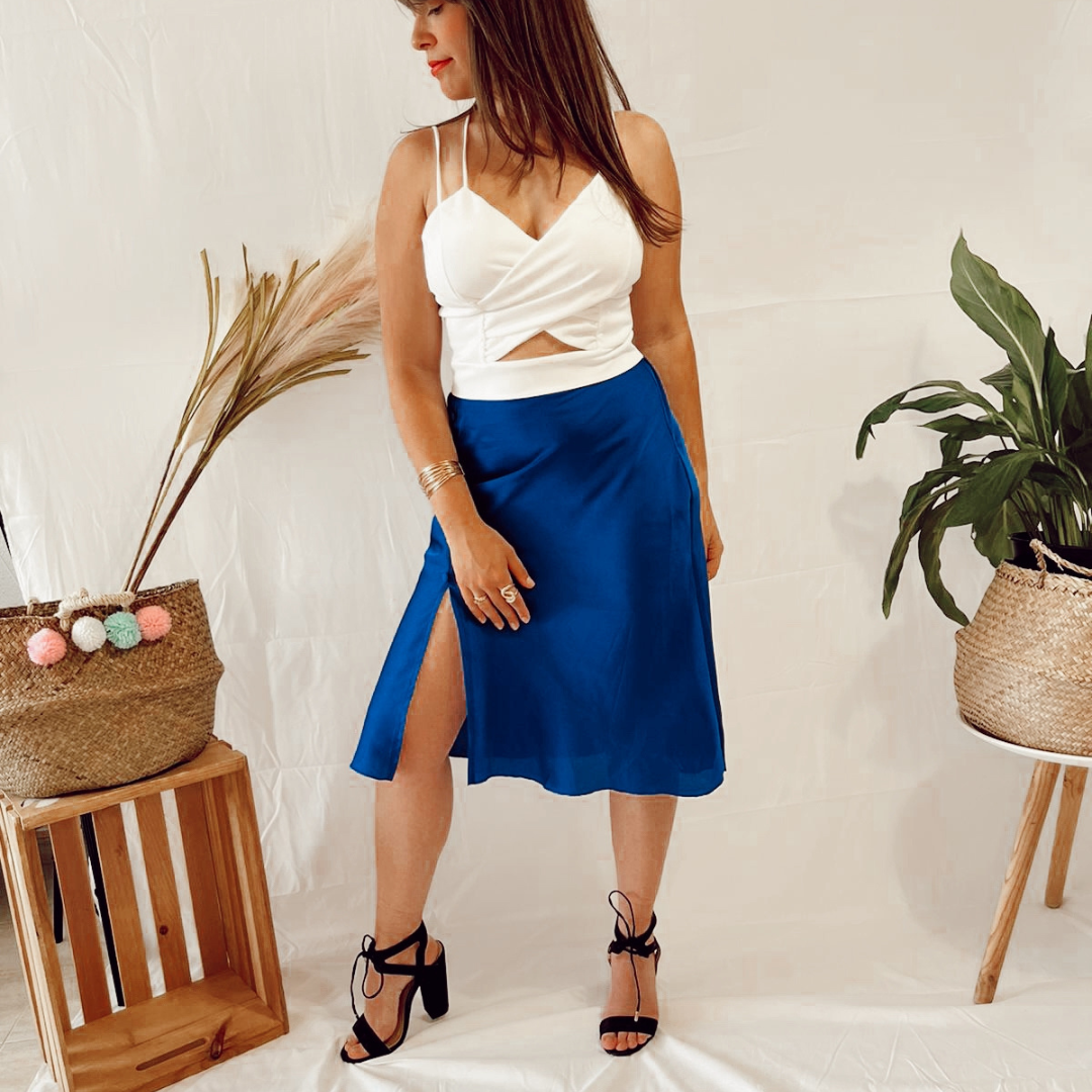 La Falda Seda es una opción ideal para un look sofisticado. Con una abertura lateral que añade movimiento, esta falda es de talla única, con medidas que se adaptan cómodamente.