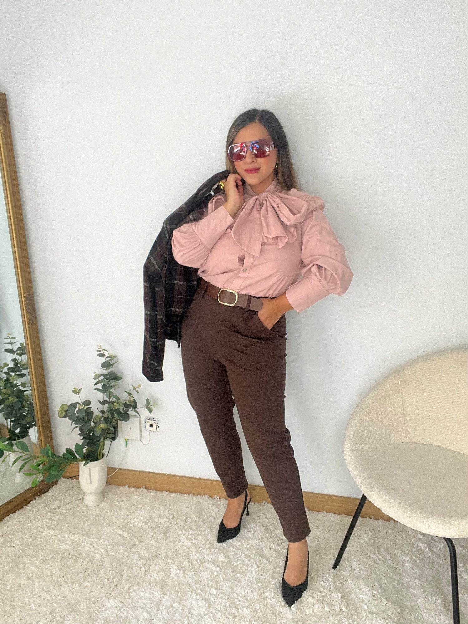 - Cintura alta con cinturón del mismo tono y hebilla metálica