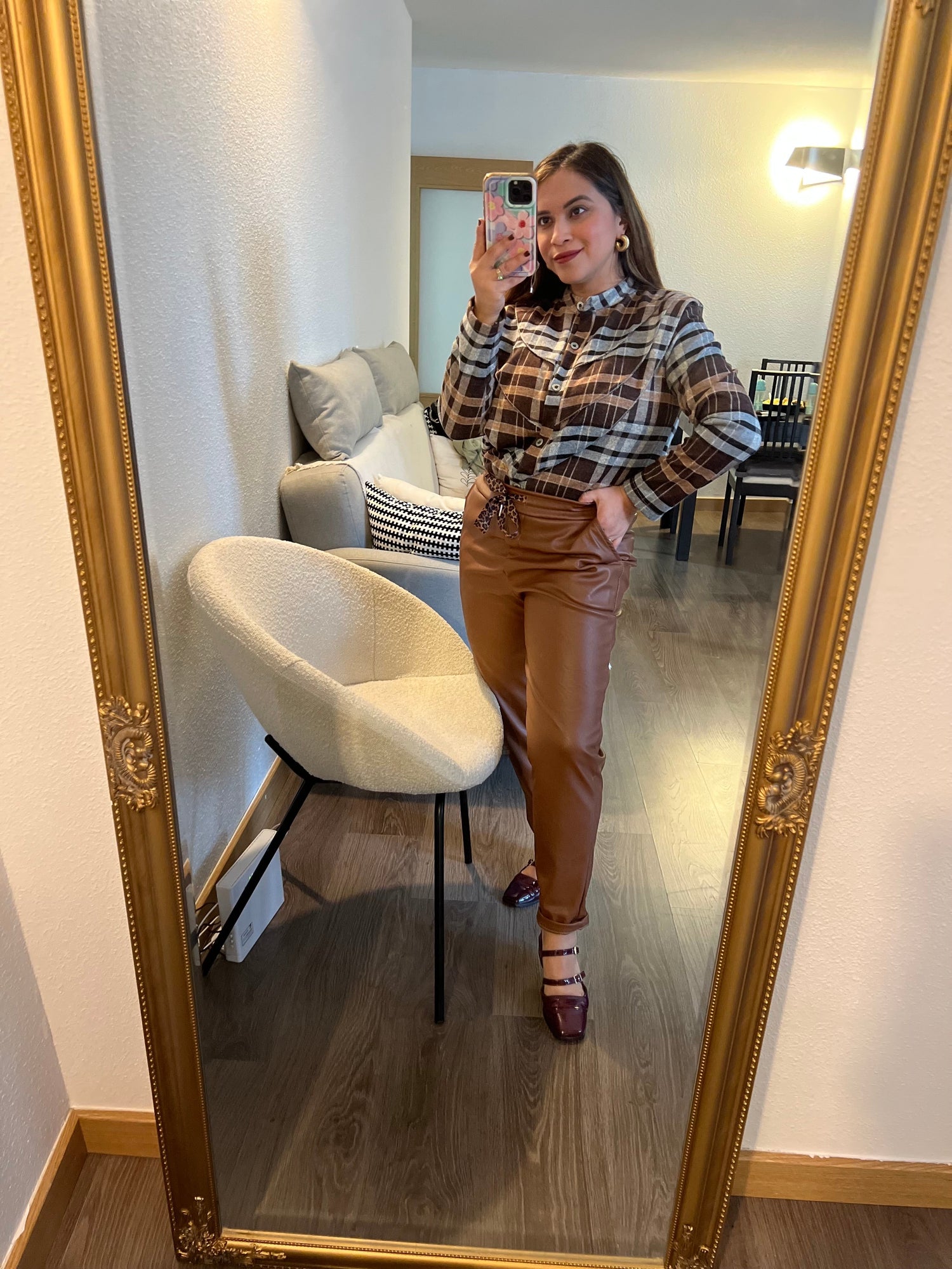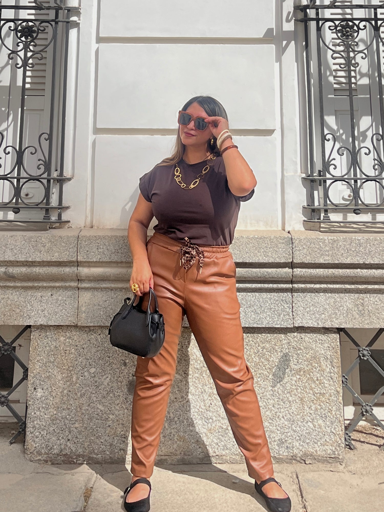 Pantalón Marrón en Polipiel con Cintura Elástica
