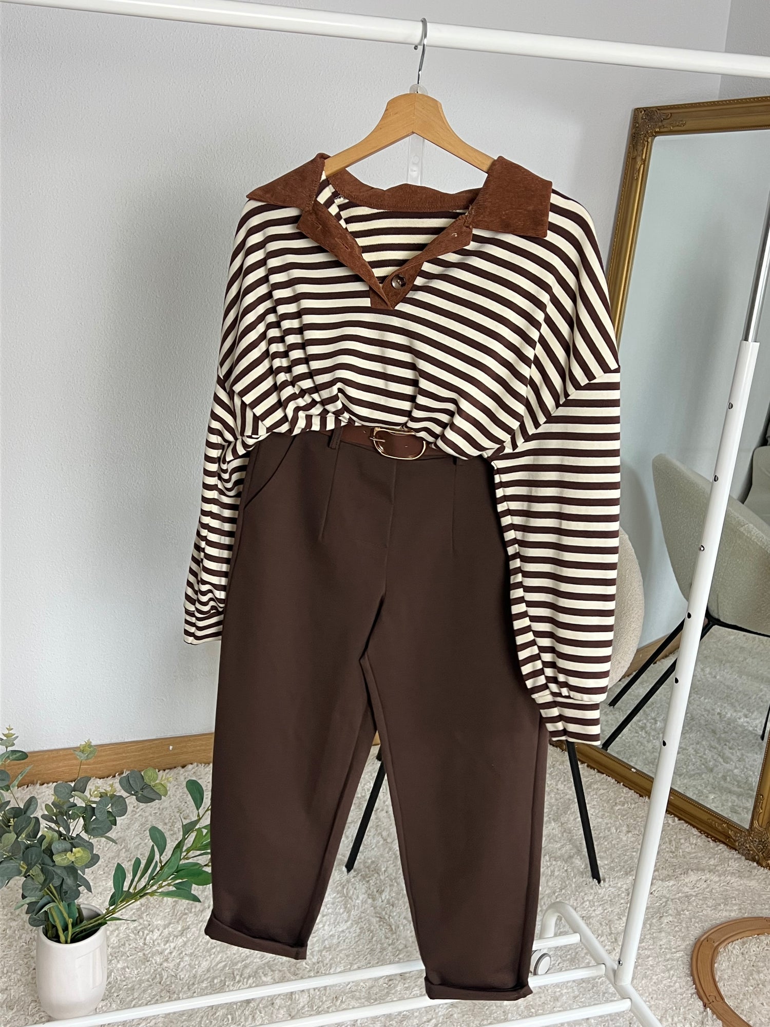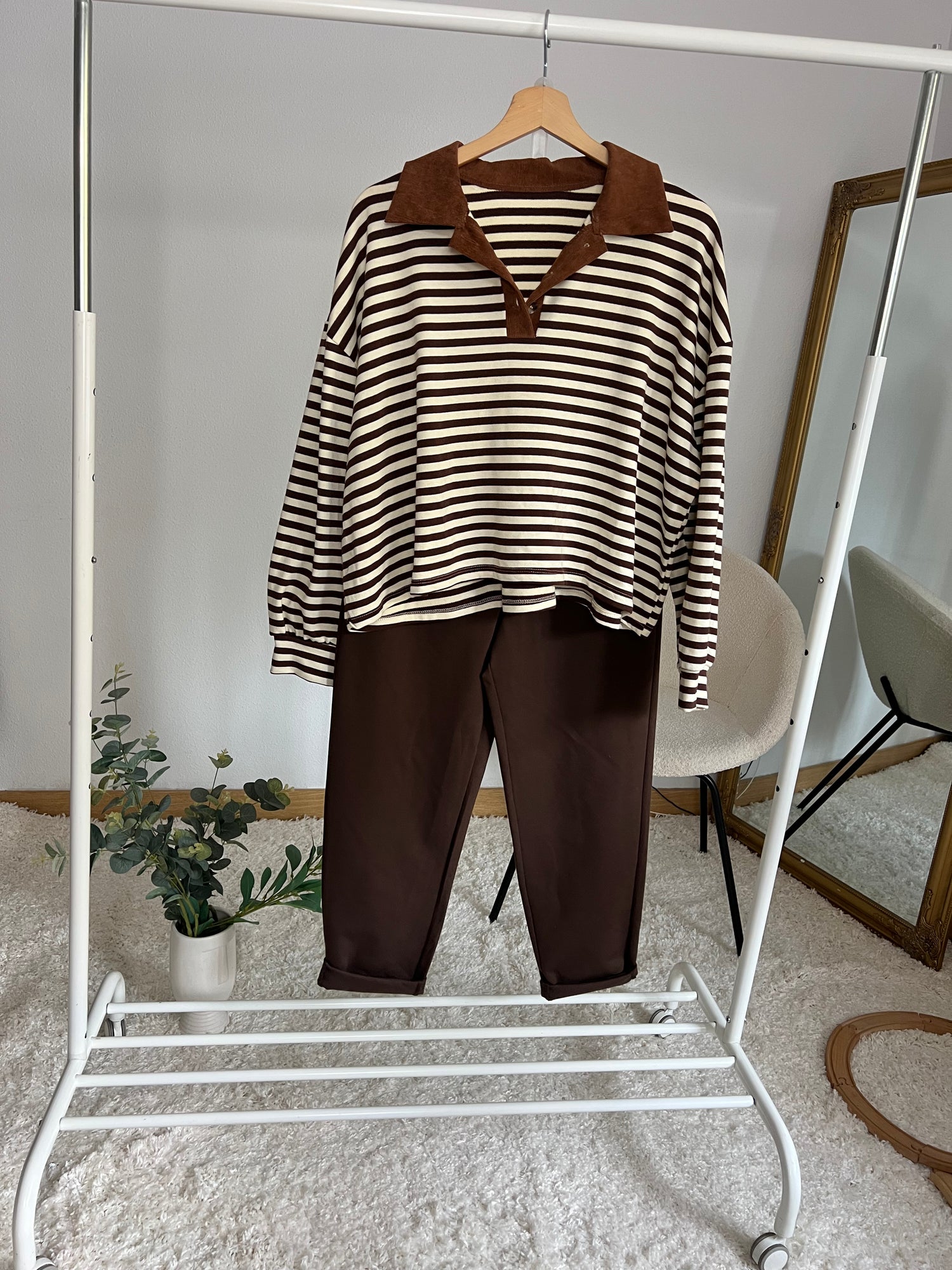 EL Jersey Rayas Caramelo combina estilo y comodidad en una prenda versátil que eleva cualquier look del día a día. Su diseño a rayas en tonos marrón y beige aporta un toque moderno y cálido, ideal para la temporada.