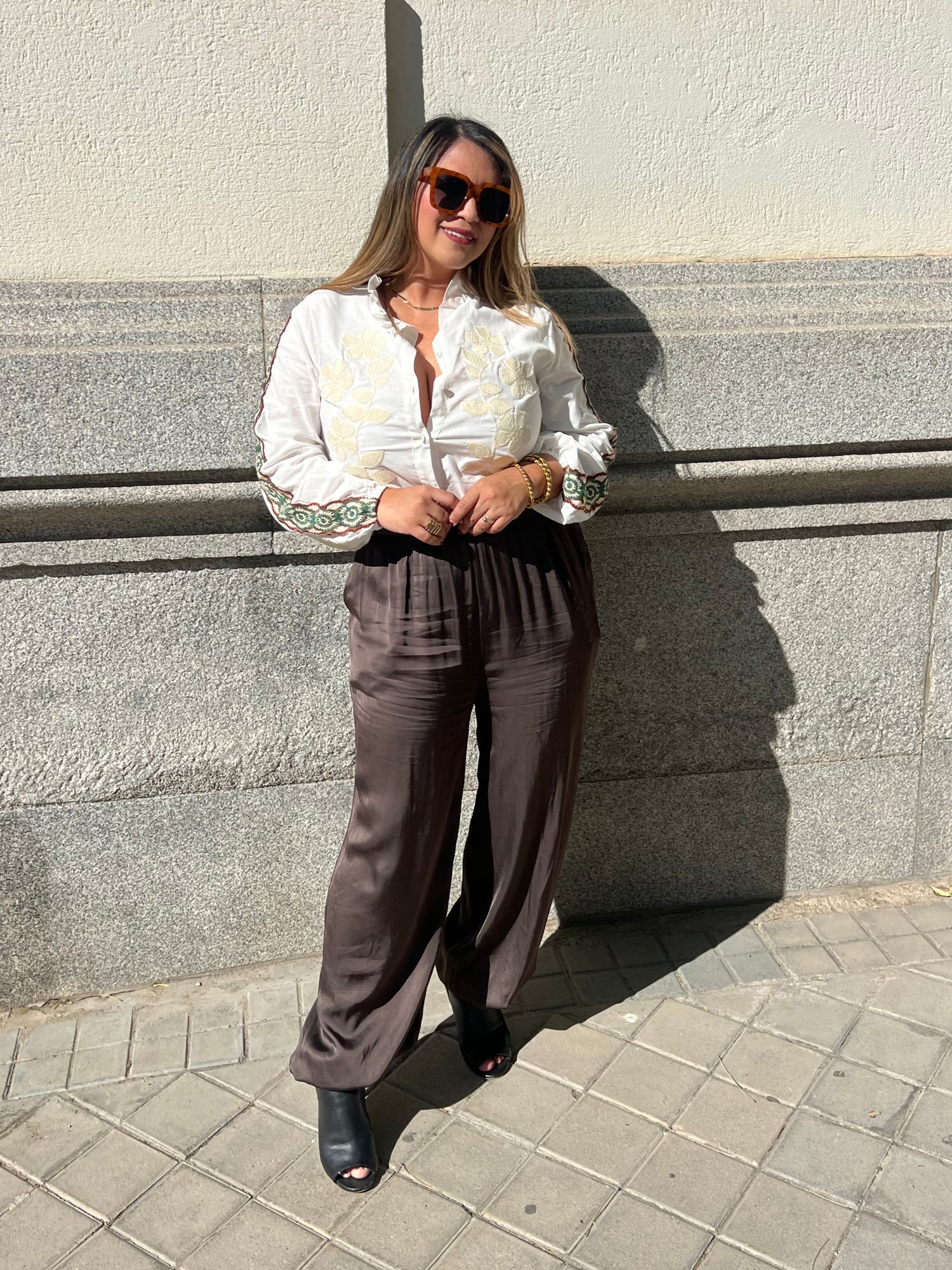 Pantalones bombacho Color chocolate cintura elástica material satén