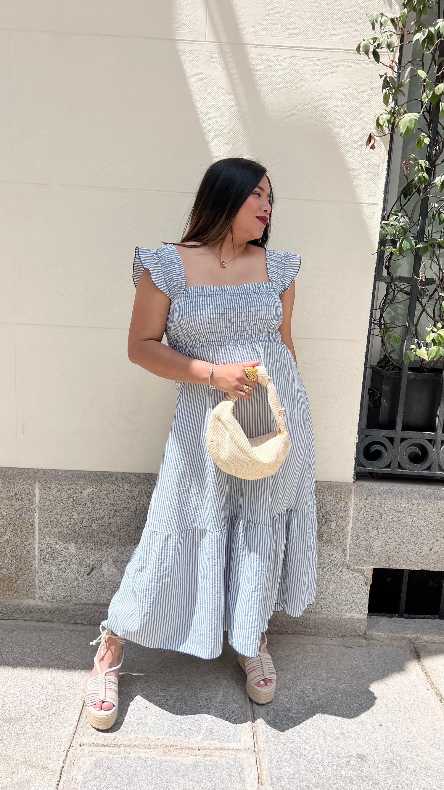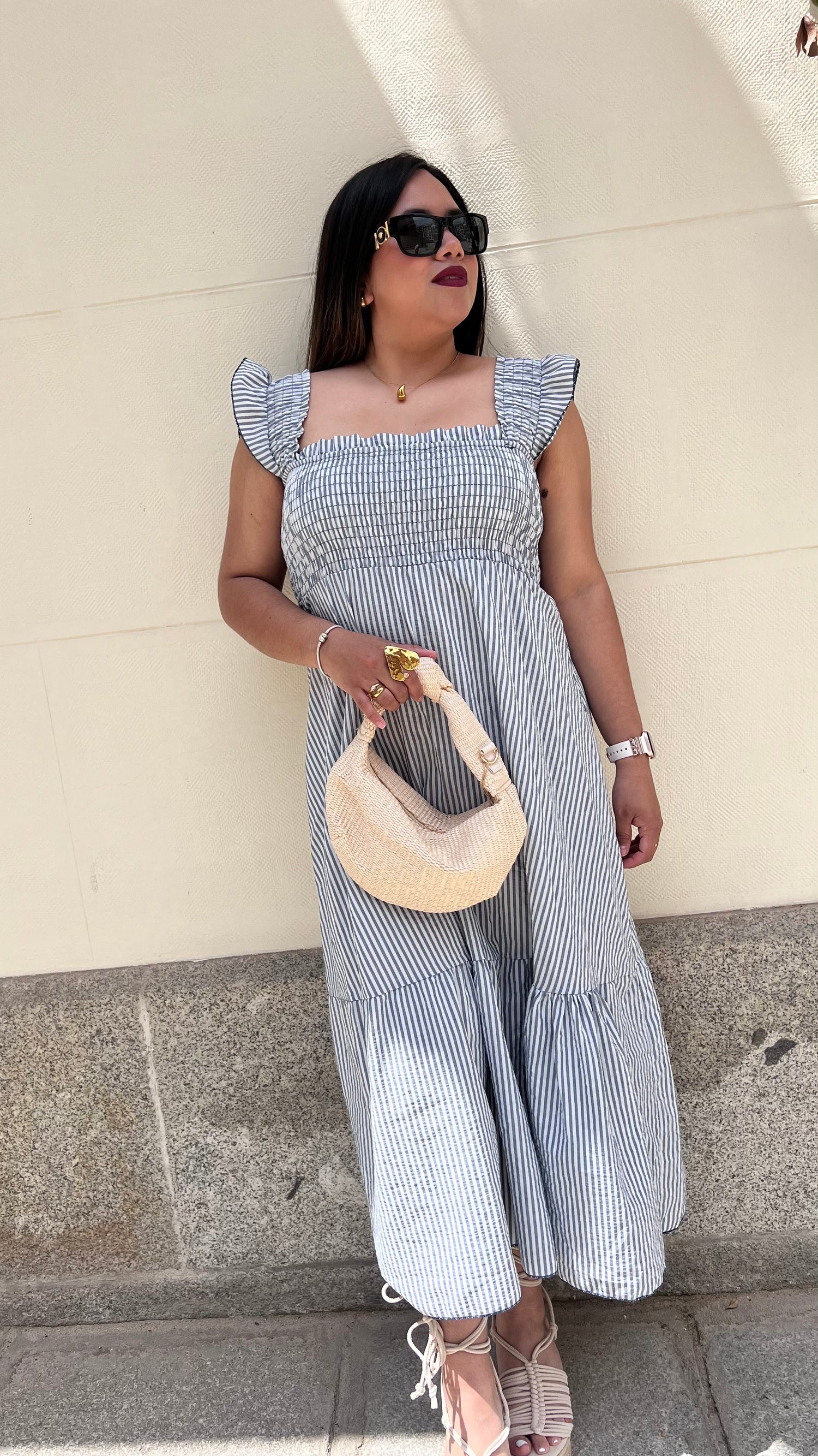 Este vestido midi es la elección perfecta para un look fresco, cómodo y elegante. Confeccionado en una ligera tela de algodón con estampado de finas rayas verticales en blanco y azul celeste, cuenta con un favorecedor diseño de escote cuadrado y cuerpo tipo nido de abeja (smocked) que se adapta suavemente al busto. ALas mangas con volantes añaden un toque femenino y romántico, mientras que la falda amplia de corte evasé aporta movimiento y comodidad.
